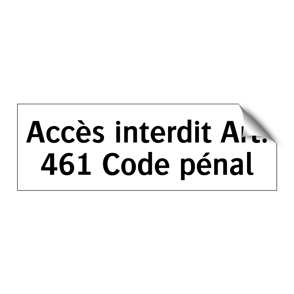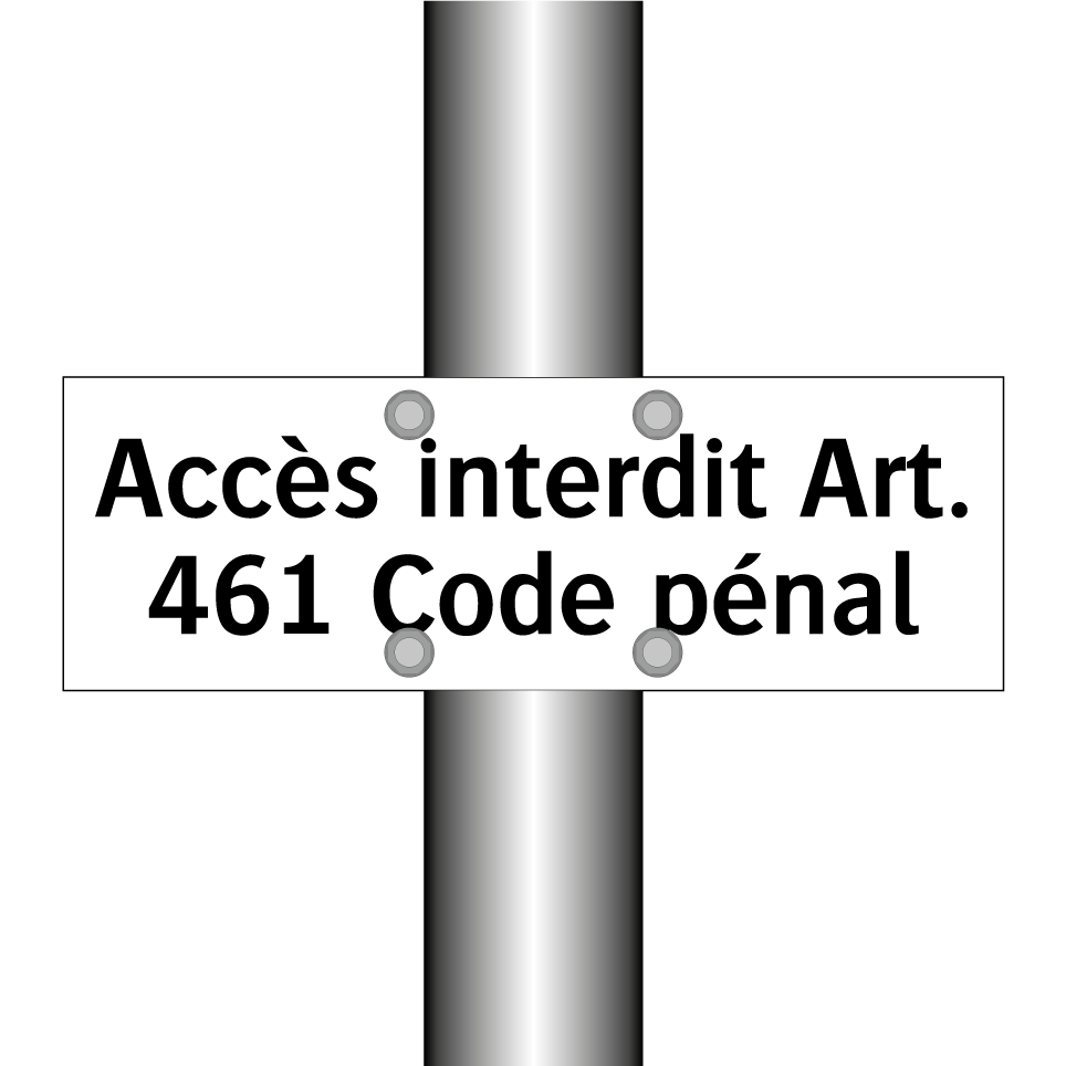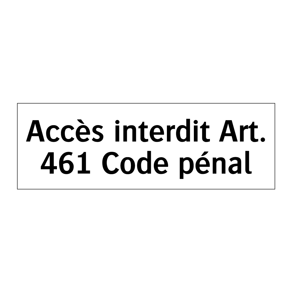 Panneau d'interdiction avec le texte : "Accès interdit Art. 461 Code pénal"