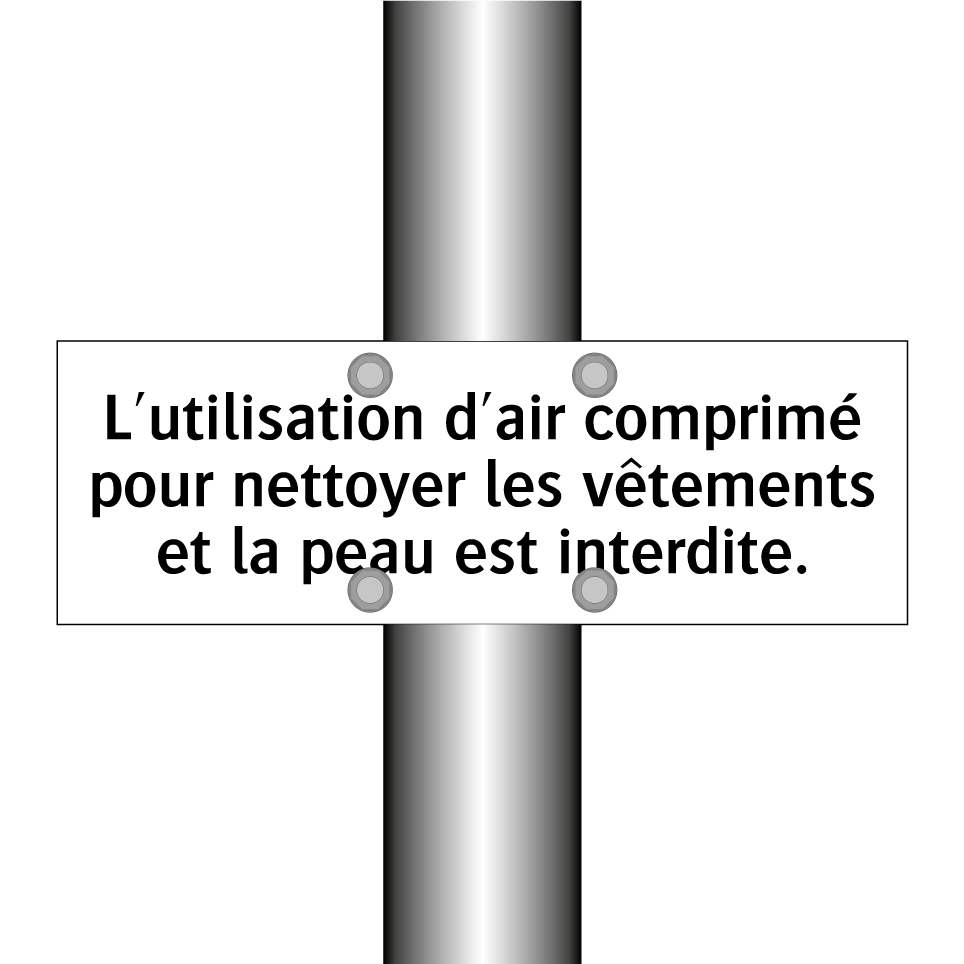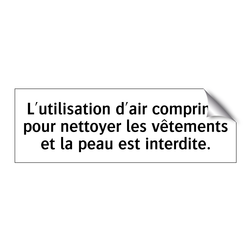 Panneau d'interdiction avec le texte : "L'utilisation d'air comprimé pour nettoyer les vêtements et la peau est interdite."
