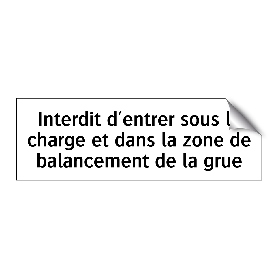 Panneau d'interdiction avec le texte : "Interdit d'entrer sous la charge et dans la zone de balancement de la grue"