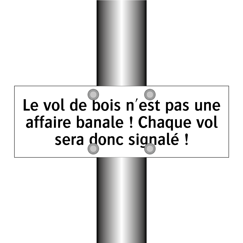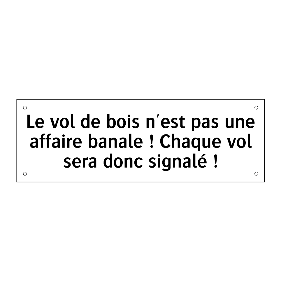 Panneau d'interdiction avec le texte : "Le vol de bois n'est pas une affaire banale ! Chaque vol sera donc signalé !"