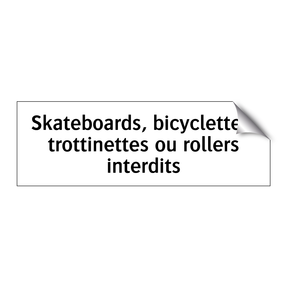 Panneau d'interdiction avec le texte : "Skateboards, bicyclettes, trottinettes ou rollers interdits"