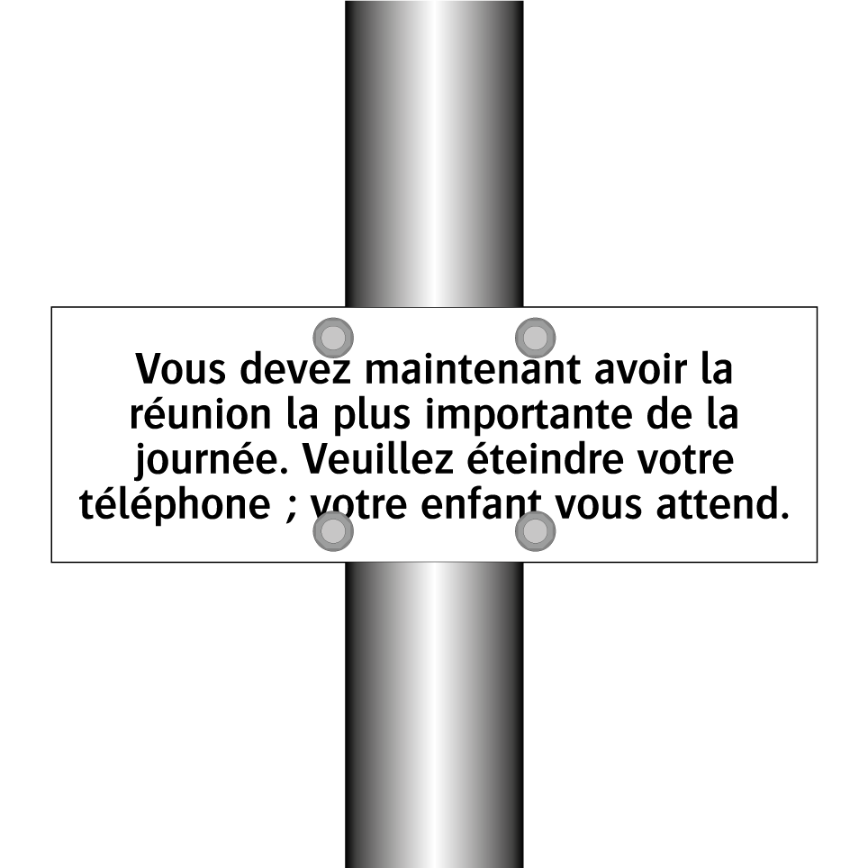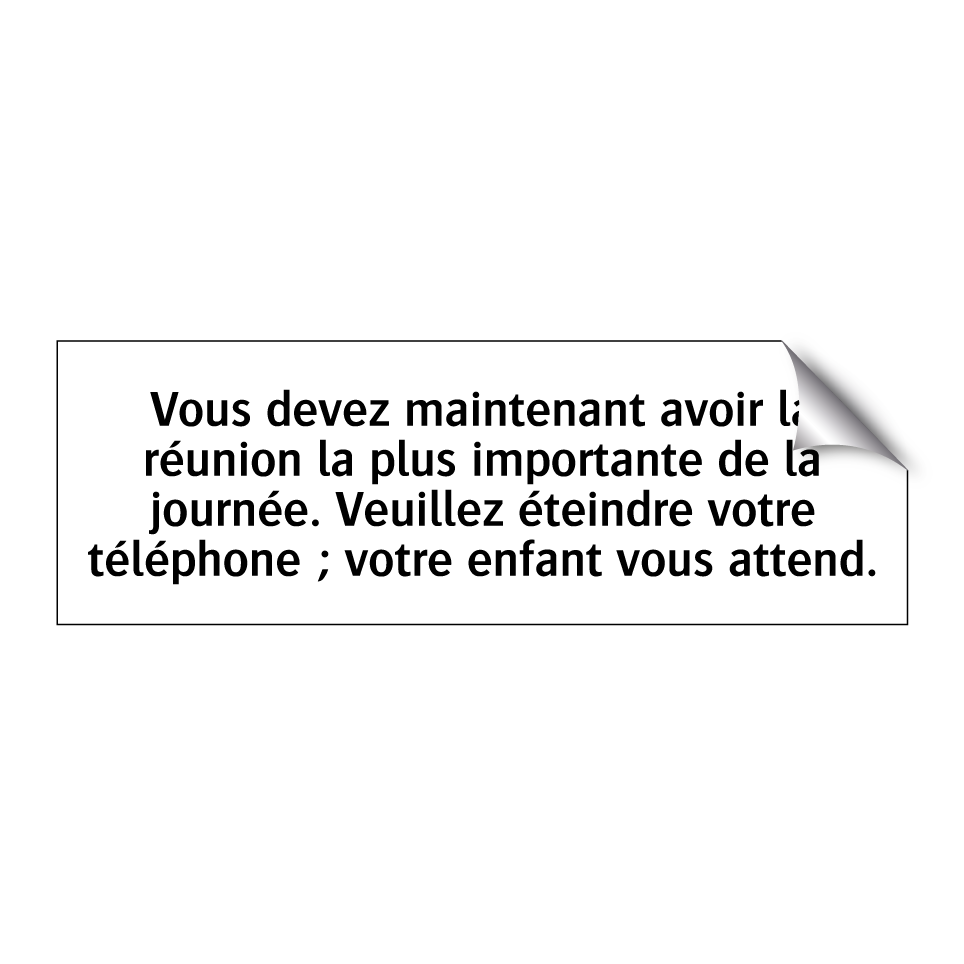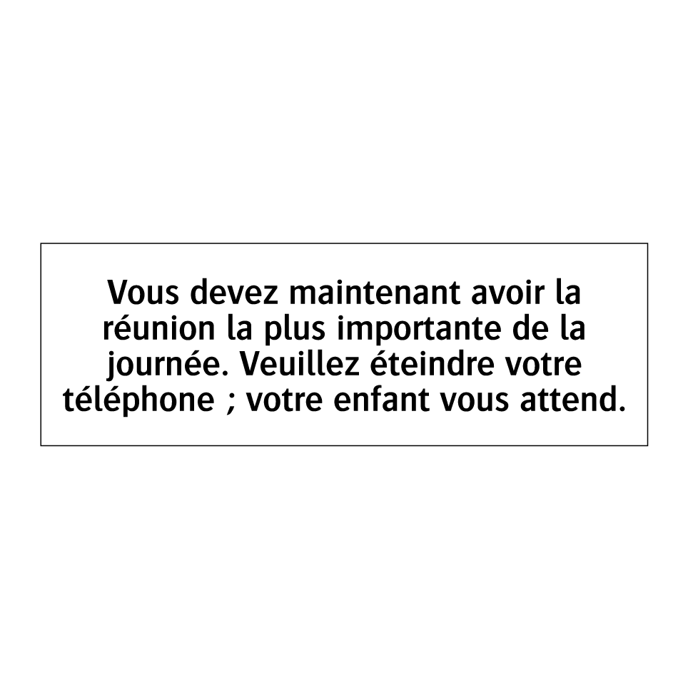 Panneau d'interdiction avec le texte : "Vous devez maintenant avoir la réunion la plus importante de la journée. Veuillez éteindre votre téléphone ; votre enfant vous attend."