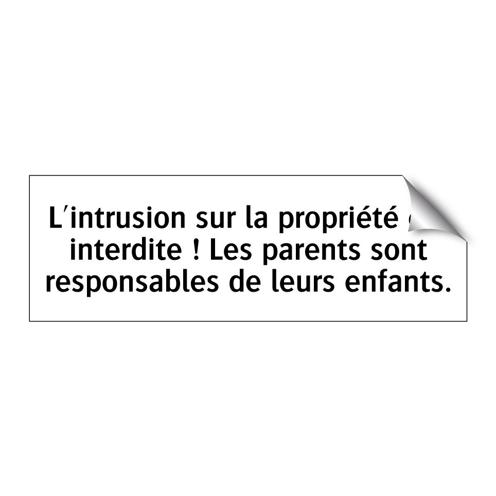 Panneau d'interdiction avec le texte : "L'intrusion sur la propriété est interdite ! Les parents sont responsables de leurs enfants."