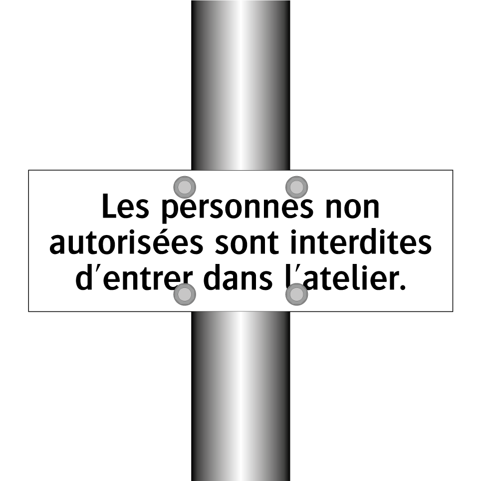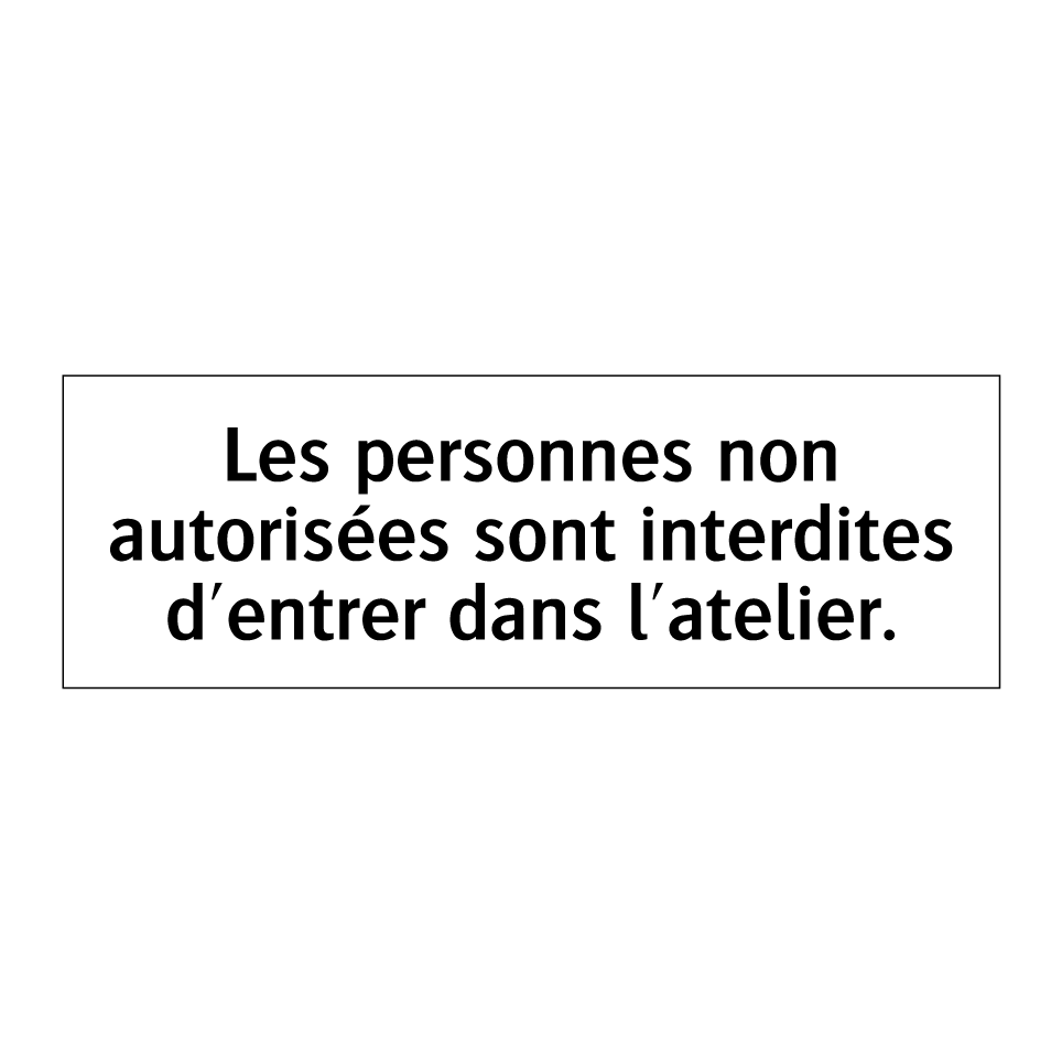 Panneau d'interdiction avec le texte : "Les personnes non autorisées sont interdites d'entrer dans l'atelier."