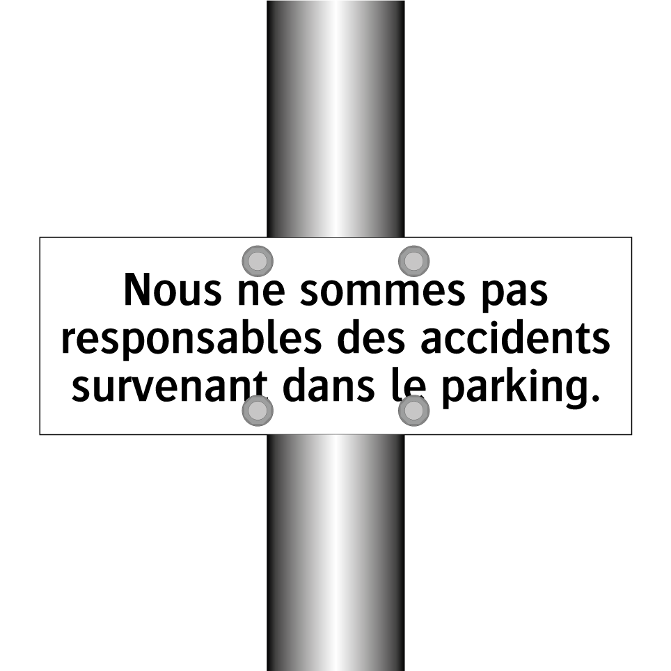 Panneau d'interdiction avec le texte : "Nous ne sommes pas responsables des accidents survenant dans le parking."