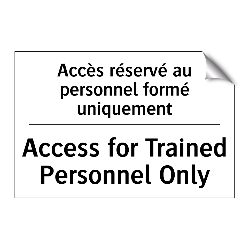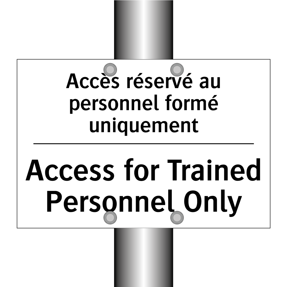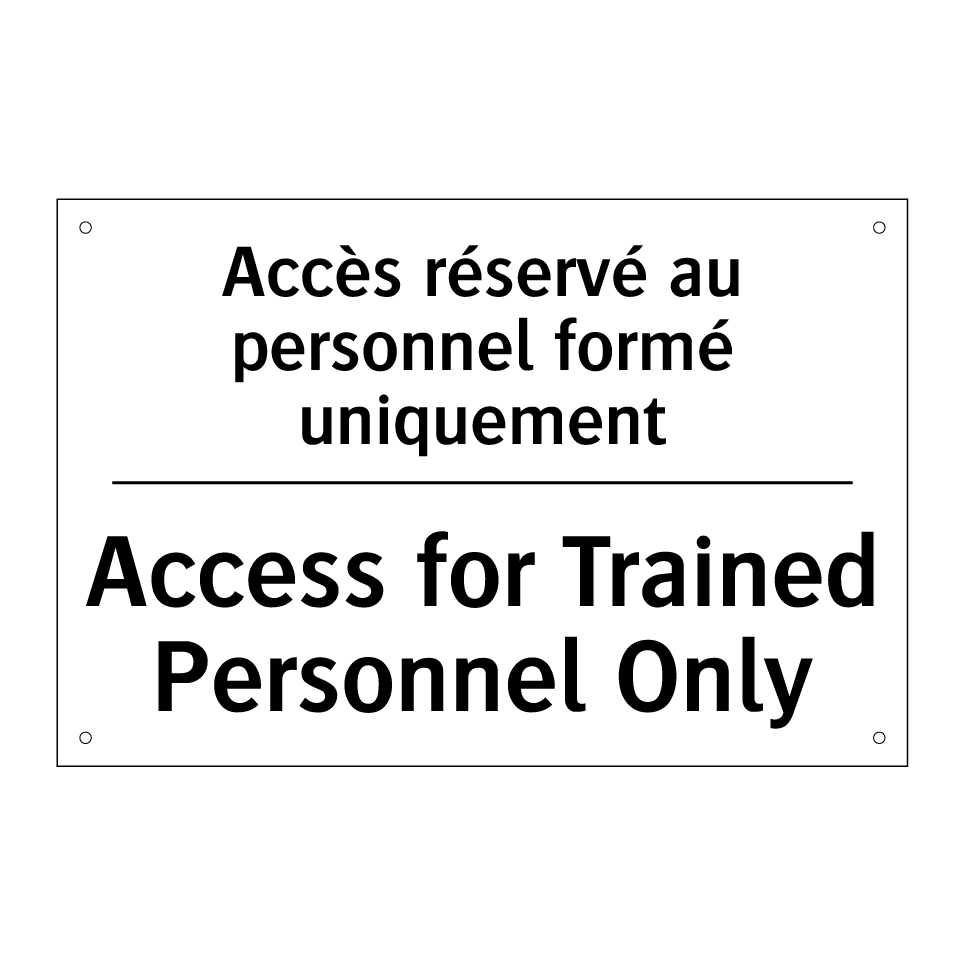 Panneau d'interdiction bilingue avec texte en français : "Accès réservé au personnel formé uniquement", et en anglais : "Access for Trained Personnel Only"