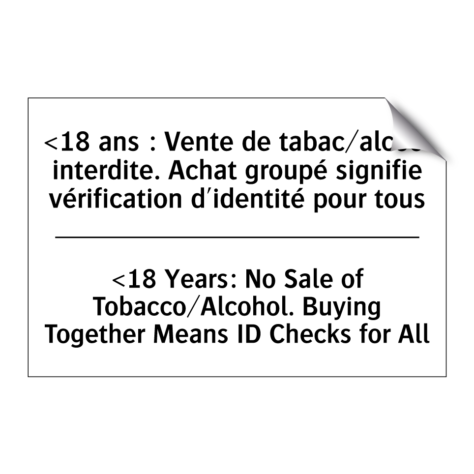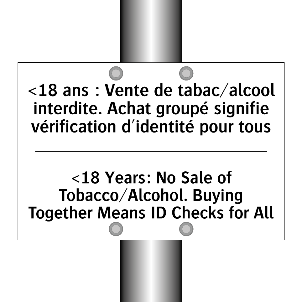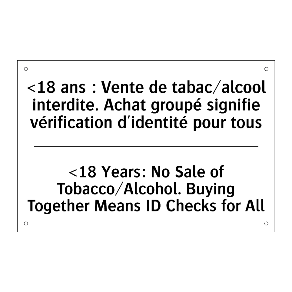 Panneau d'interdiction bilingue avec texte en français : "<18 ans : Vente de tabac/alcool interdite. Achat groupé signifie vérification d'identité pour tous", et en anglais : "<18 Years: No Sale of Tobacco/Alcohol. Buying Together Means ID Checks for All"