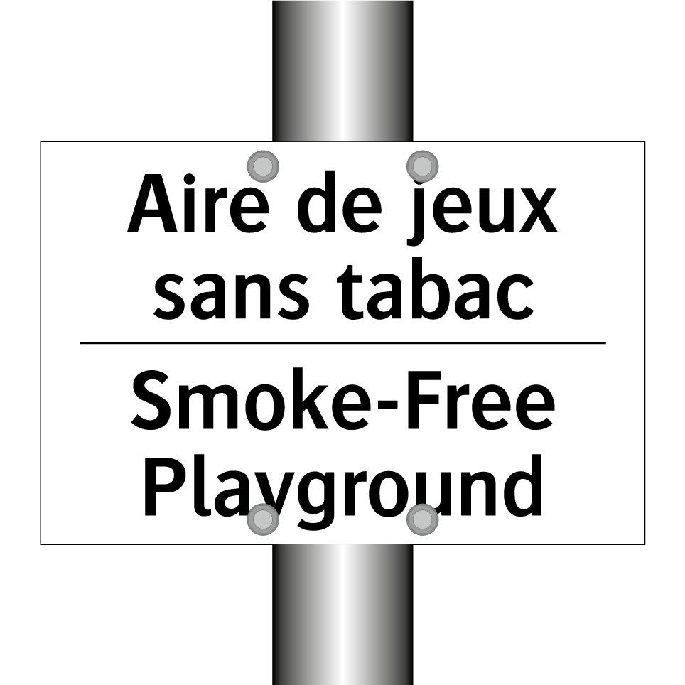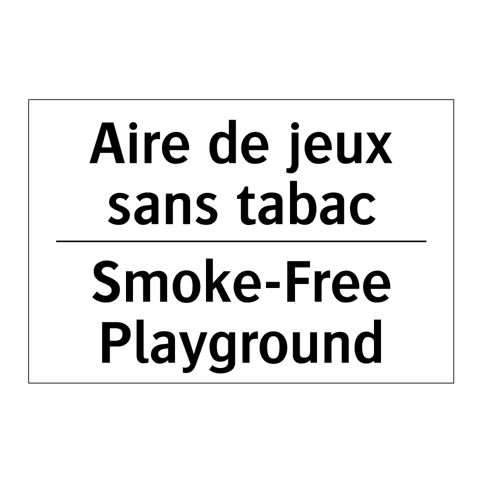 Panneau d'interdiction bilingue avec texte en français : "Aire de jeux sans tabac", et en anglais : "Smoke-Free Playground"