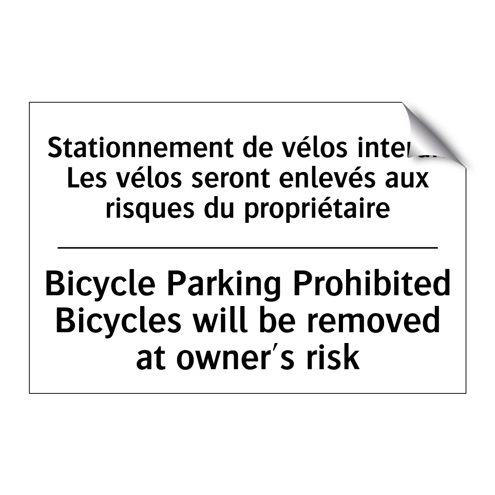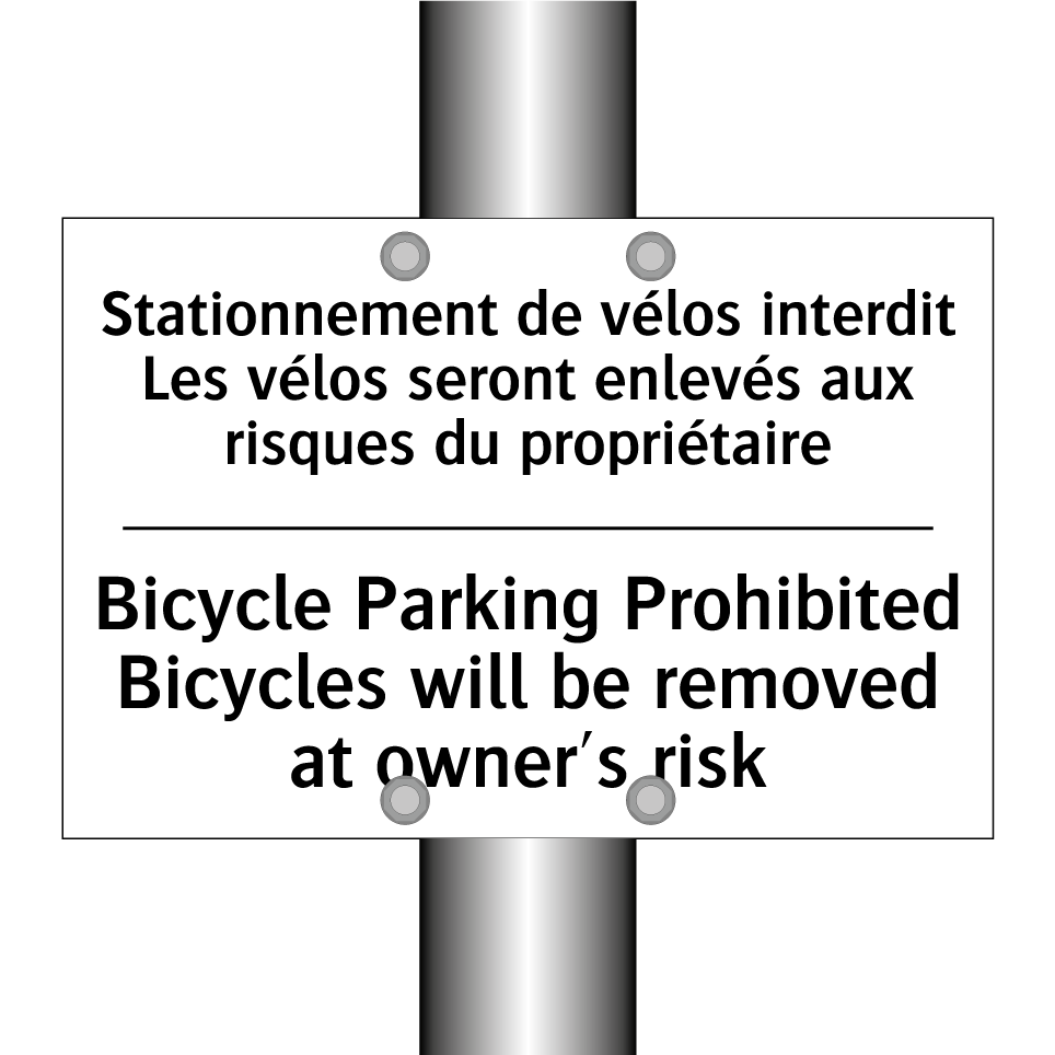 Panneau d'interdiction bilingue avec texte en français : "Stationnement de vélos interdit Les vélos seront enlevés aux risques du propriétaire", et en anglais : "Bicycle Parking Prohibited Bicycles will be removed at owner's risk"