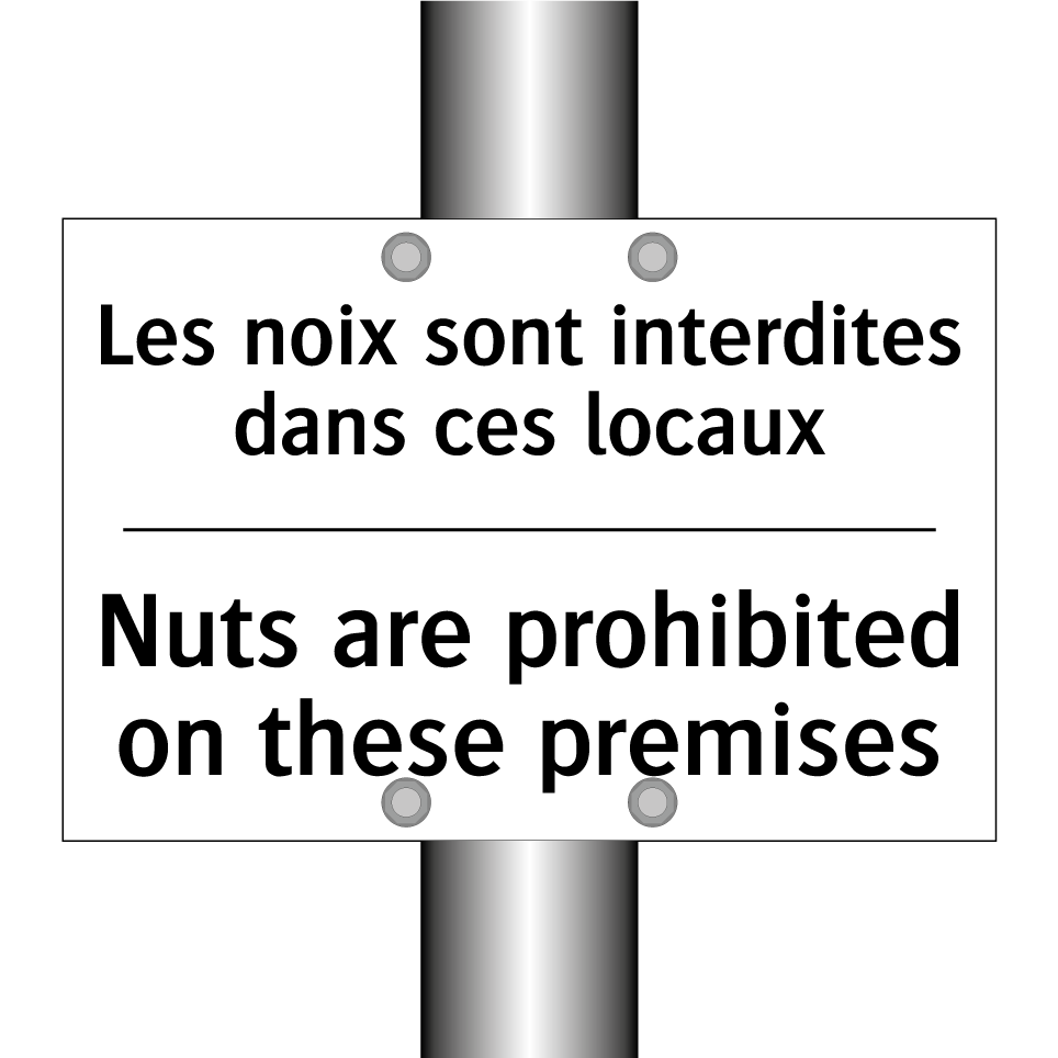 Panneau d'interdiction bilingue avec texte en français : "Les noix sont interdites dans ces locaux", et en anglais : "Nuts are prohibited on these premises"