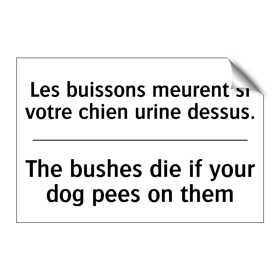 Panneau d'interdiction bilingue avec texte en français : "Les buissons meurent si votre chien urine dessus.", et en anglais : "The bushes die if your dog pees on them"