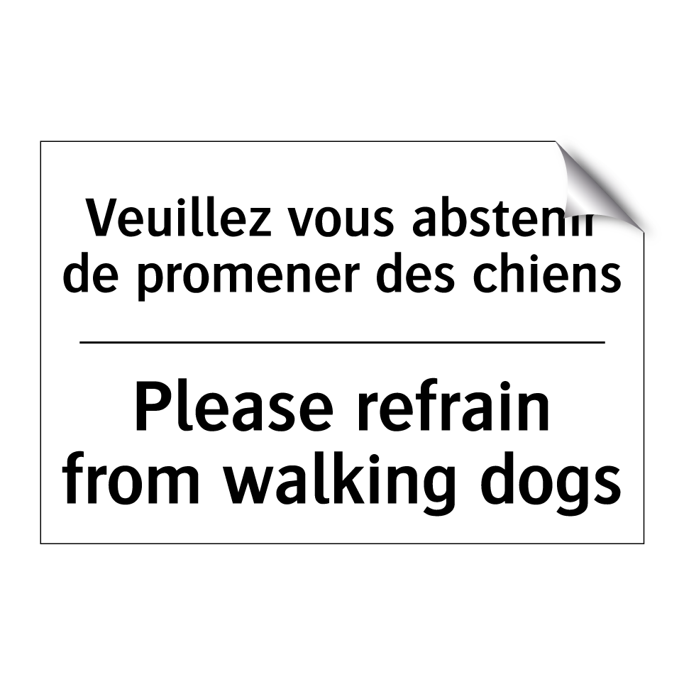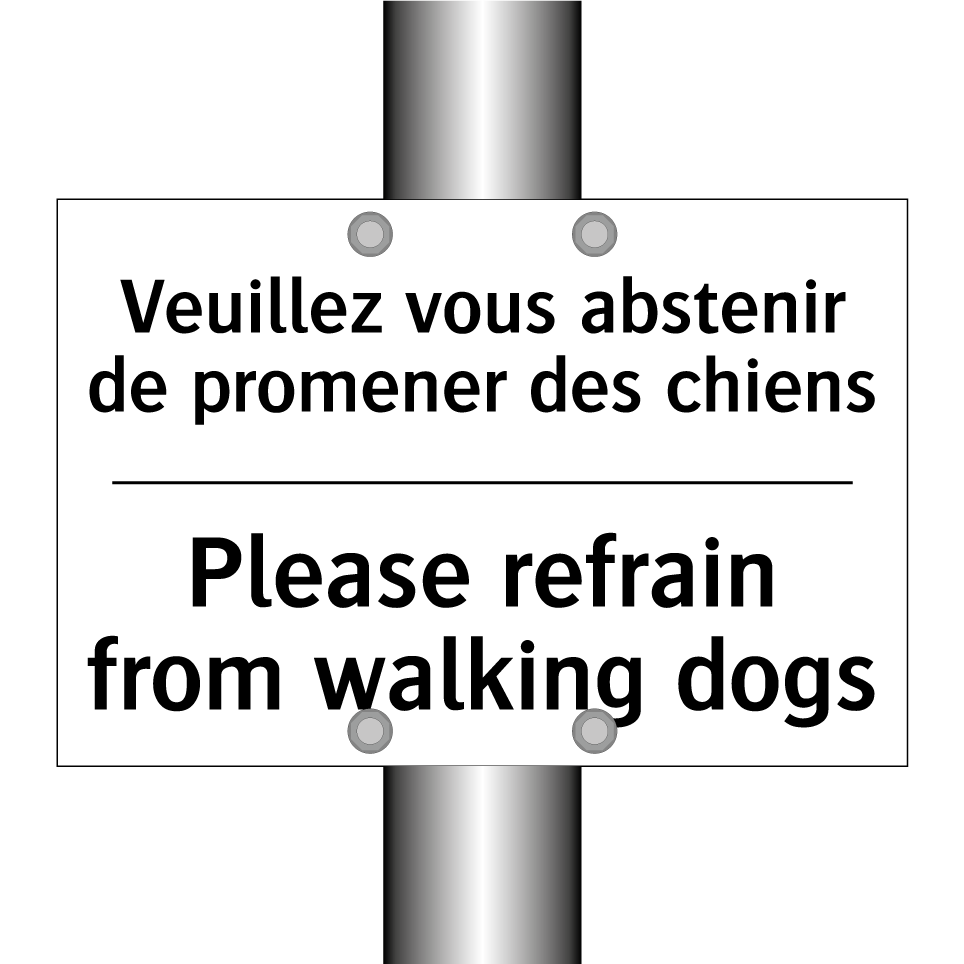 Panneau d'interdiction bilingue avec texte en français : "Veuillez vous abstenir de promener des chiens", et en anglais : "Please refrain from walking dogs"