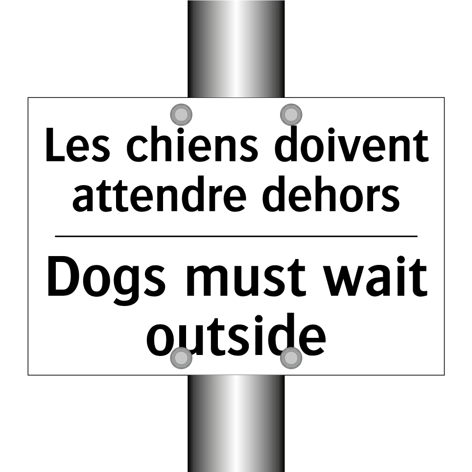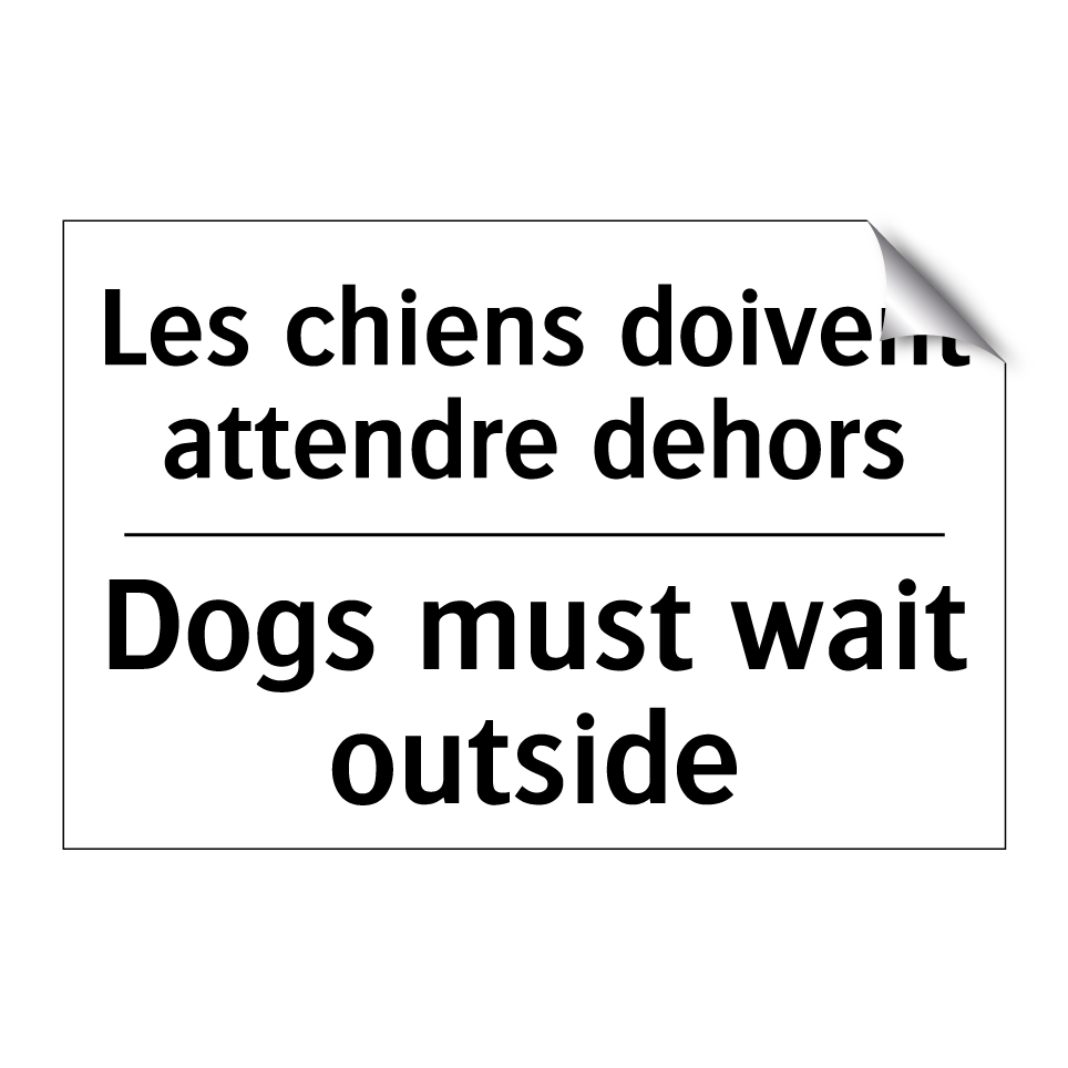 Panneau d'interdiction bilingue avec texte en français : "Les chiens doivent attendre dehors", et en anglais : "Dogs must wait outside"