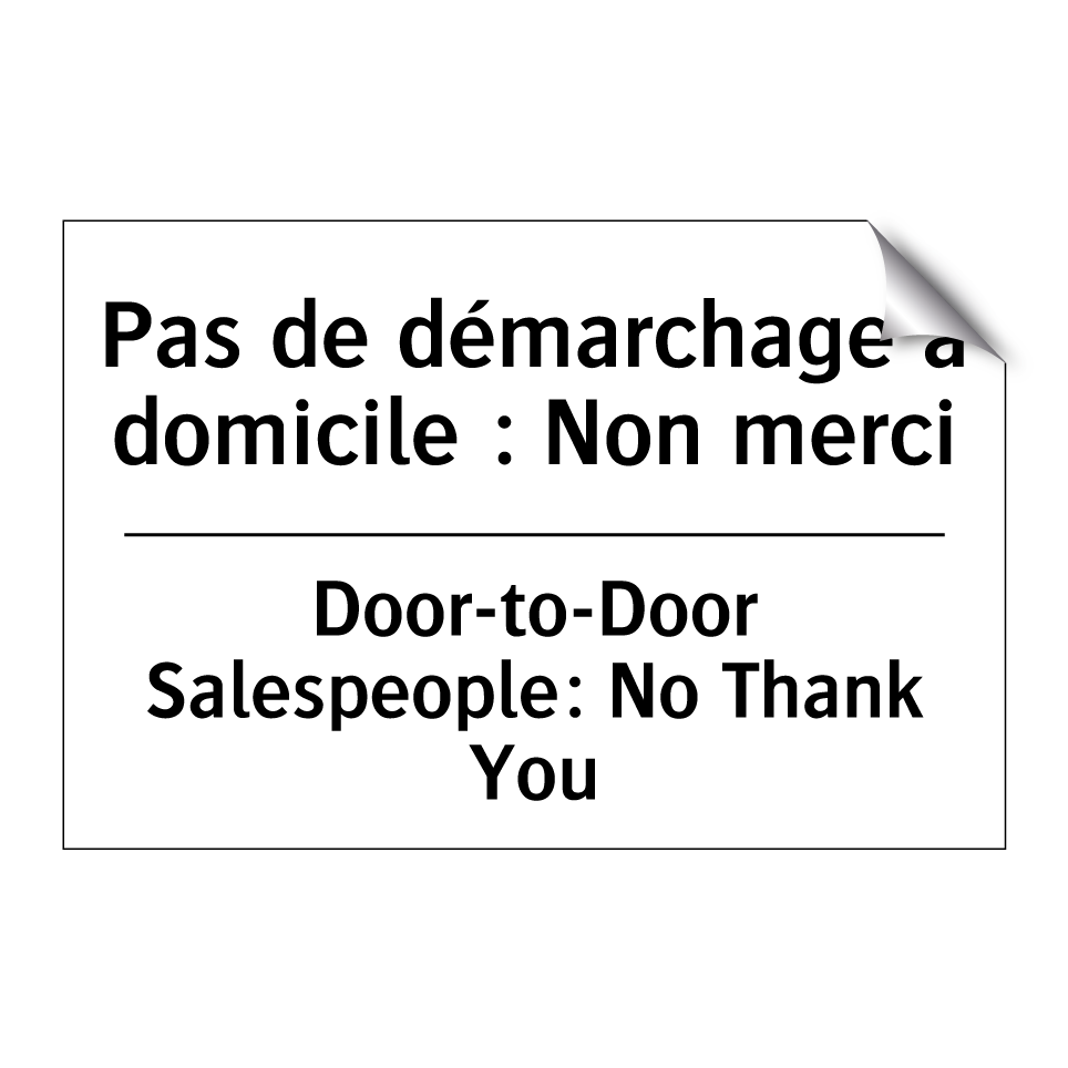 Panneau d'interdiction bilingue avec texte en français : "Pas de démarchage à domicile : Non merci", et en anglais : "Door-to-Door Salespeople: No Thank You"