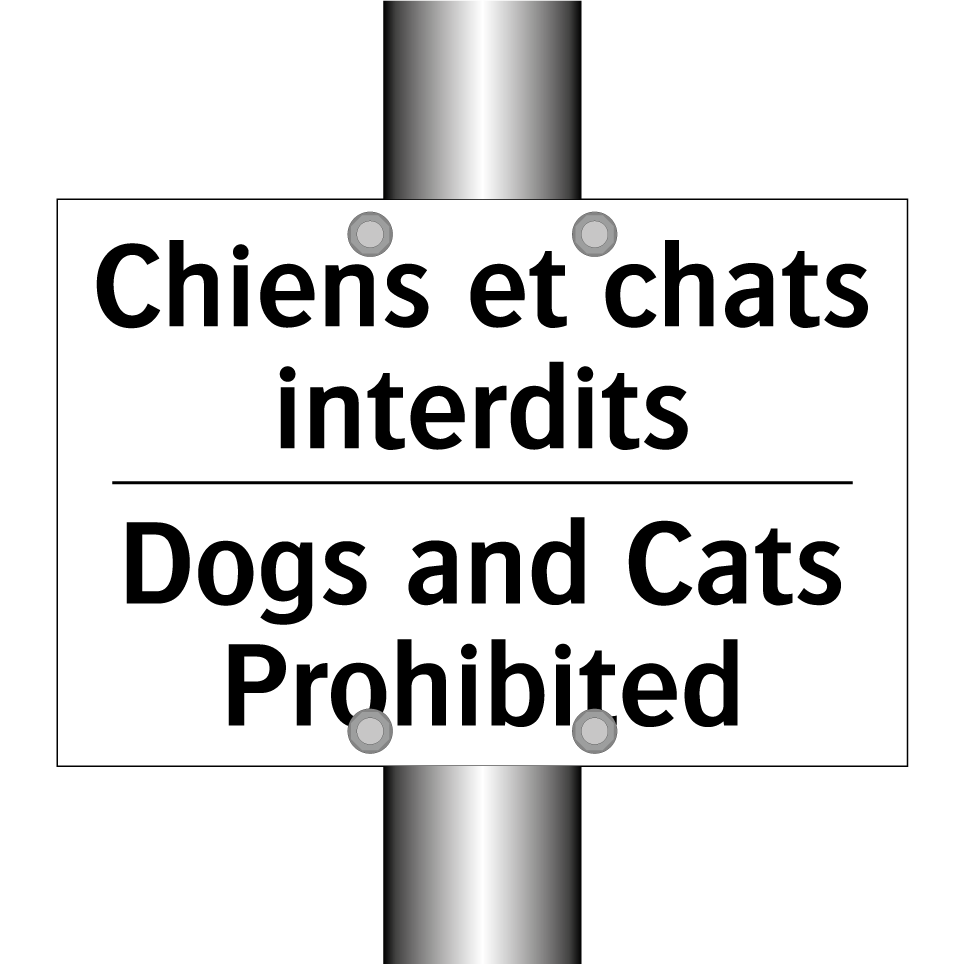 Panneau d'interdiction bilingue avec texte en français : "Chiens et chats interdits", et en anglais : "Dogs and Cats Prohibited"
