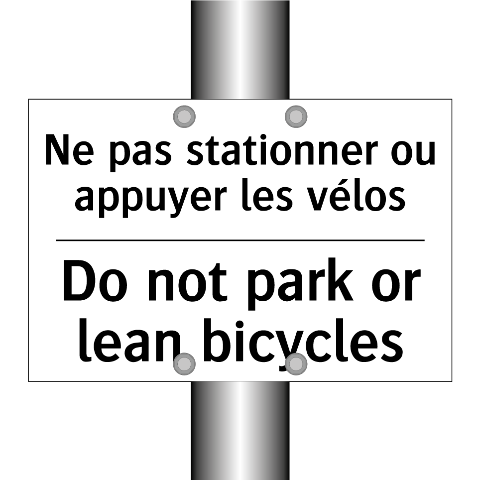 Panneau d'interdiction bilingue avec texte en français : "Ne pas stationner ou appuyer les vélos", et en anglais : "Do not park or lean bicycles"