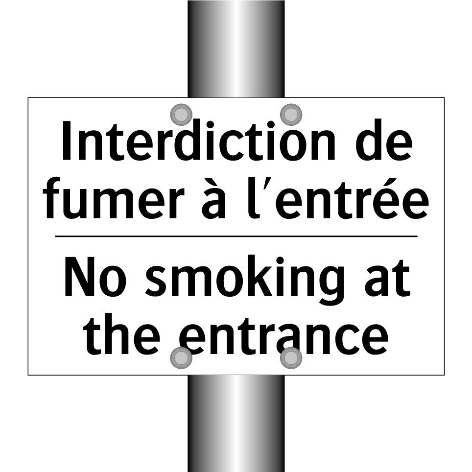 Panneau d'interdiction bilingue avec texte en français : "Interdiction de fumer à l'entrée", et en anglais : "No smoking at the entrance"