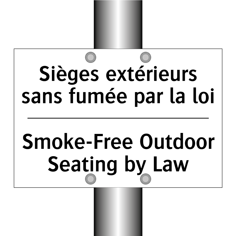 Panneau d'interdiction bilingue avec texte en français : "Sièges extérieurs sans fumée par la loi", et en anglais : "Smoke-Free Outdoor Seating by Law"