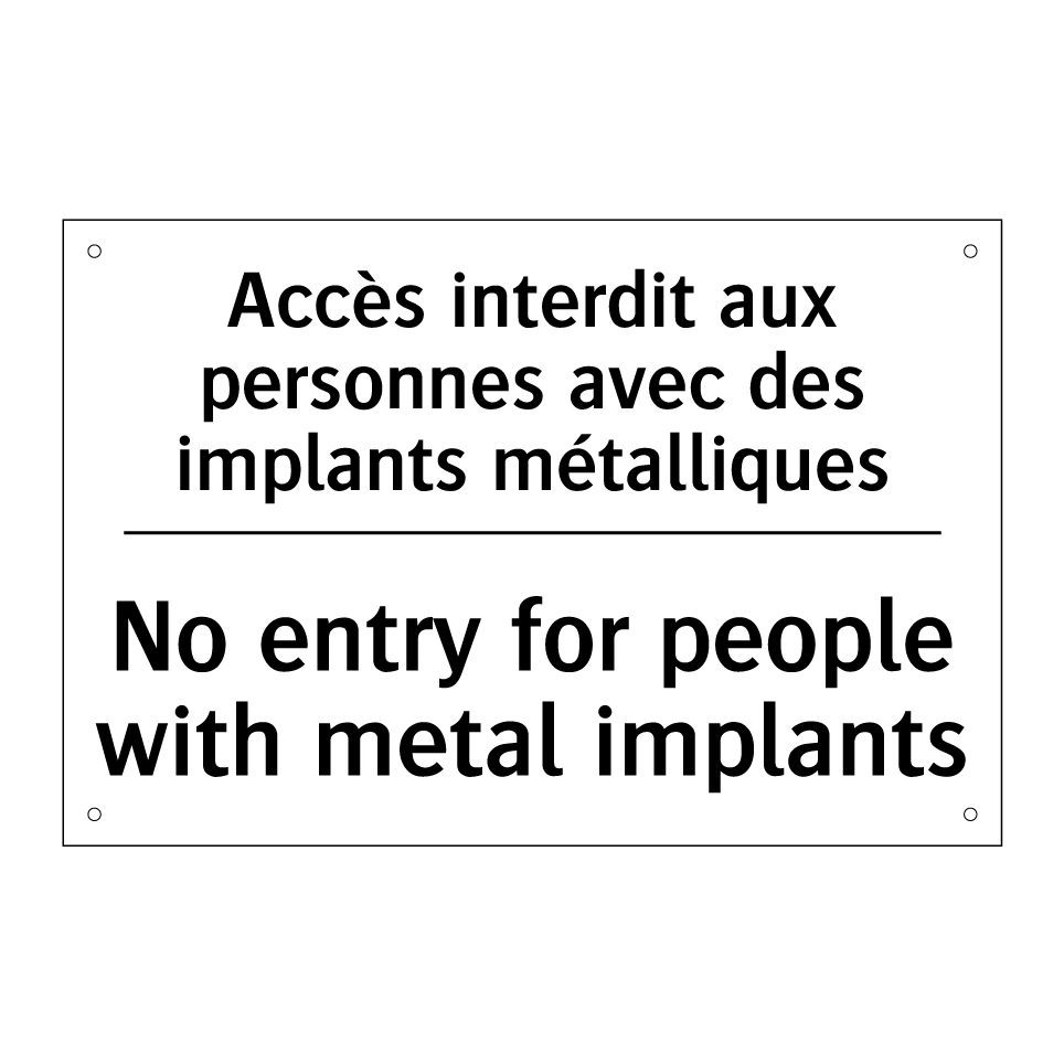 Panneau d'interdiction bilingue avec texte en français : "Accès interdit aux personnes avec des implants métalliques", et en anglais : "No entry for people with metal implants"