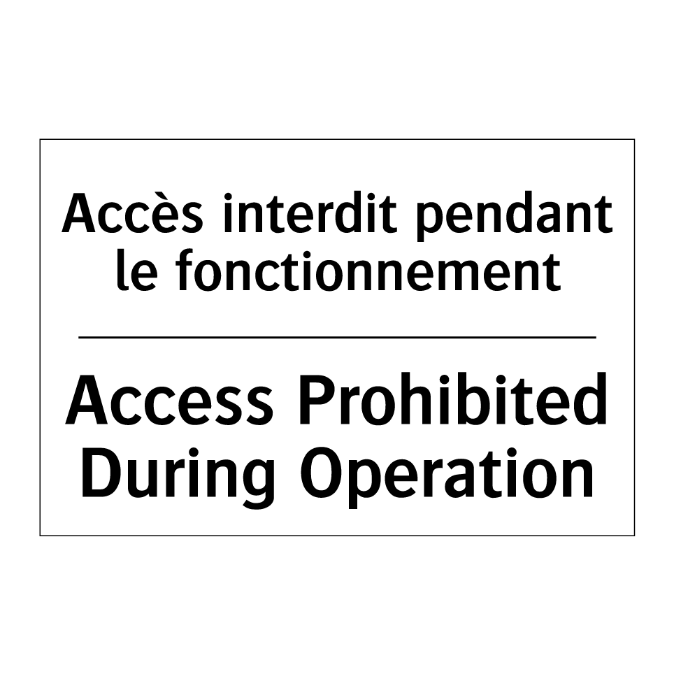 Panneau d'interdiction bilingue avec texte en français : "Accès interdit pendant le fonctionnement", et en anglais : "Access Prohibited During Operation"