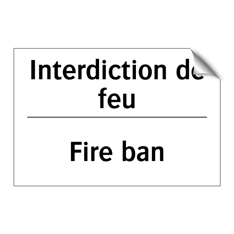 Panneau d'interdiction bilingue avec texte en français : "Interdiction de feu", et en anglais : "Fire ban"
