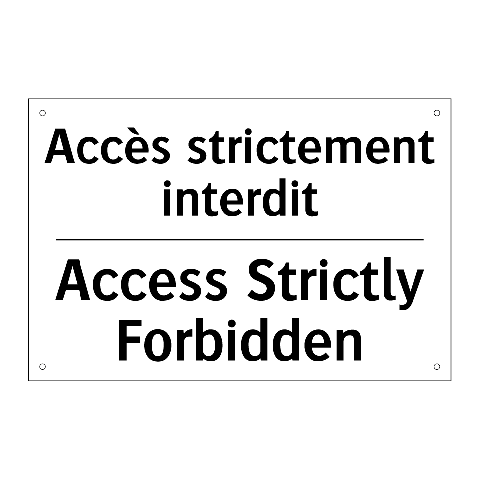 Panneau d'interdiction bilingue avec texte en français : "Accès strictement interdit", et en anglais : "Access Strictly Forbidden"