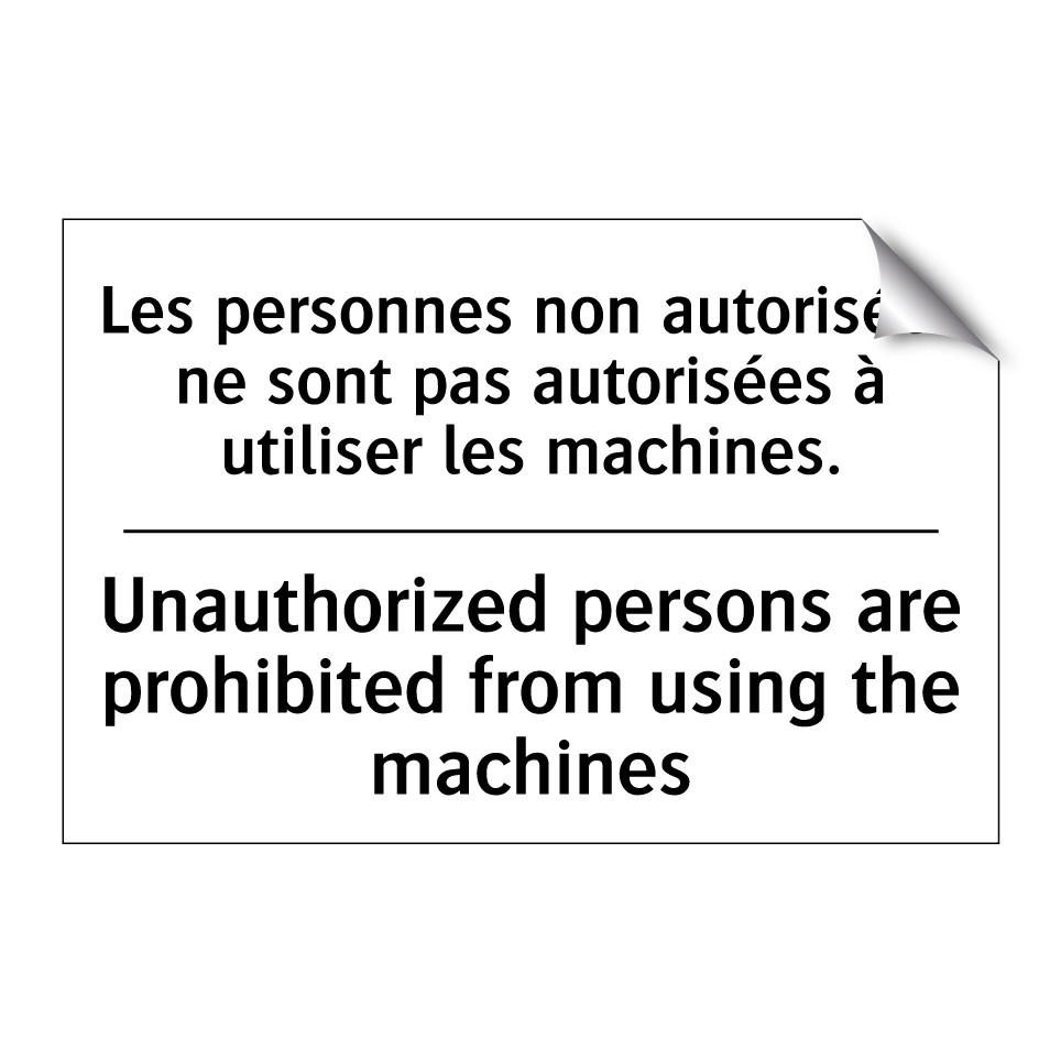 Panneau d'interdiction bilingue avec texte en français : "Les personnes non autorisées ne sont pas autorisées à utiliser les machines.", et en anglais : "Unauthorized persons are prohibited from using the machines"