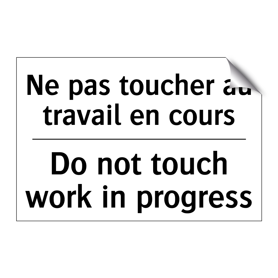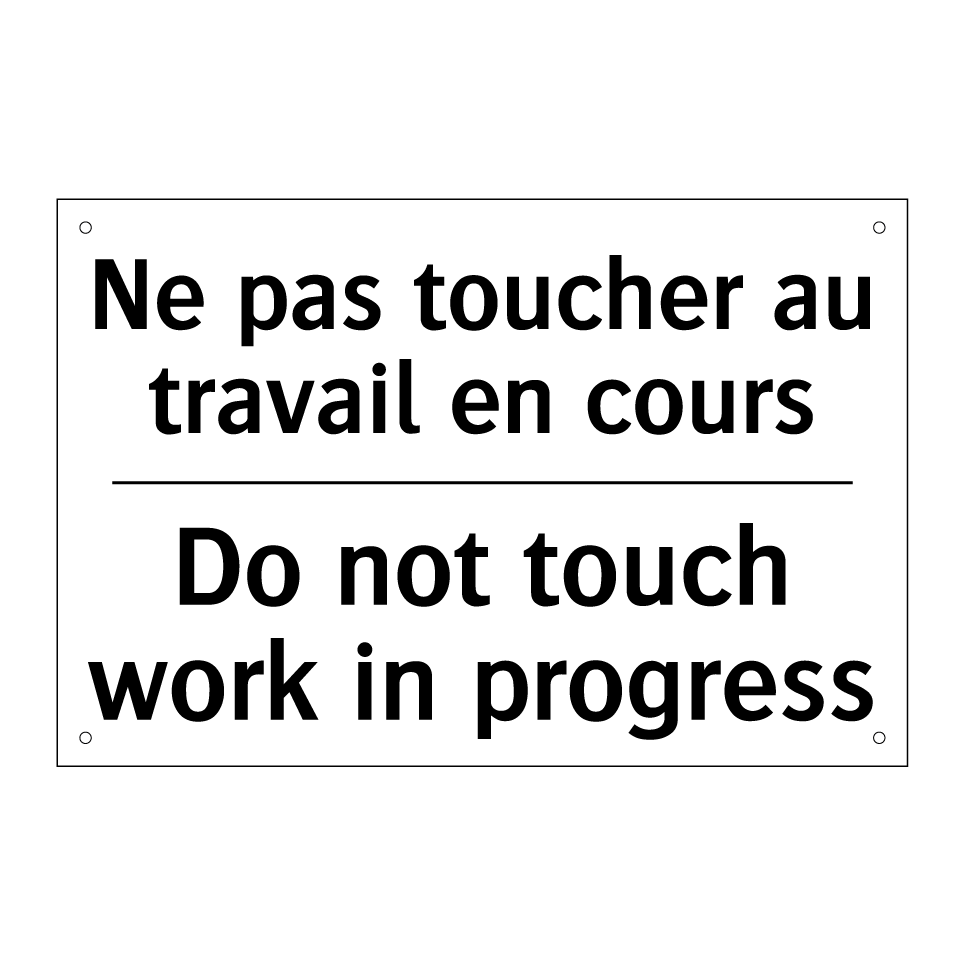 Panneau d'interdiction bilingue avec texte en français : "Ne pas toucher au travail en cours", et en anglais : "Do not touch work in progress"