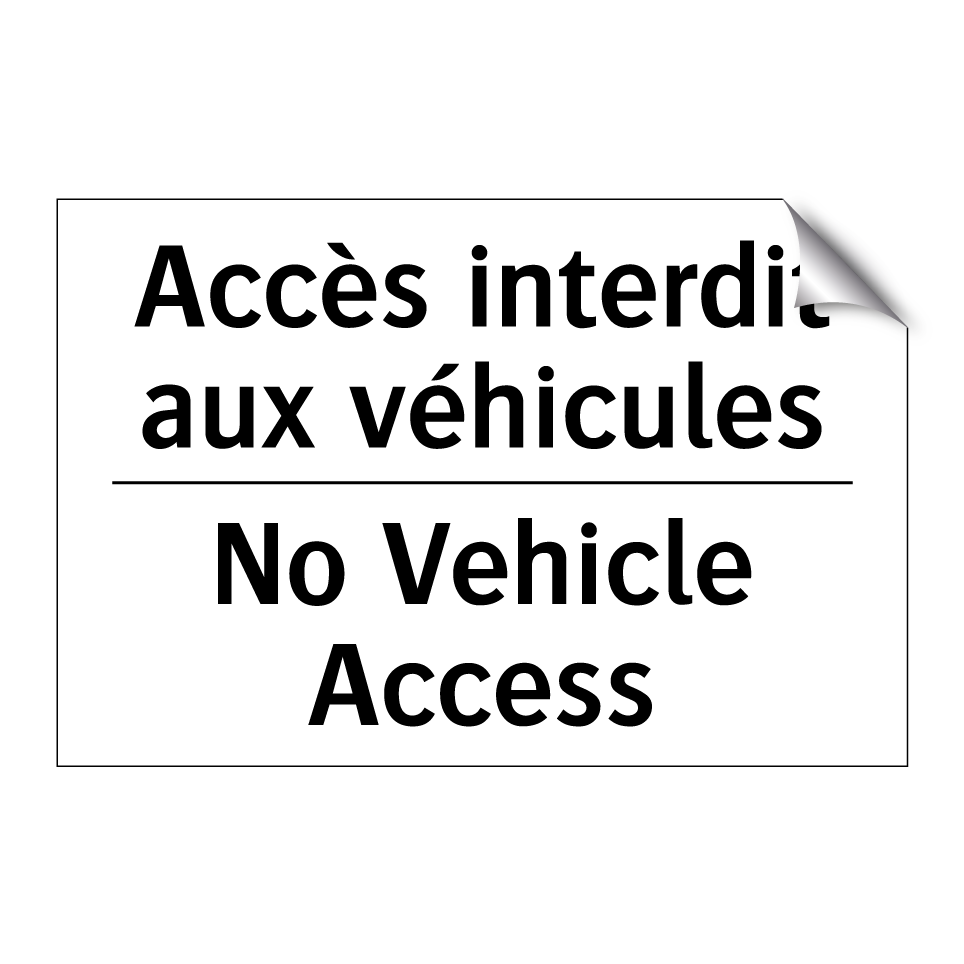 Panneau d'interdiction bilingue avec texte en français : "Accès interdit aux véhicules", et en anglais : "No Vehicle Access"