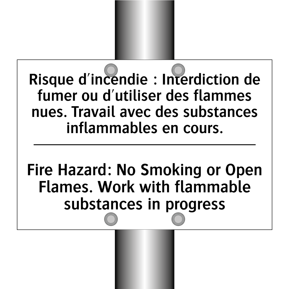 Panneau d'interdiction bilingue avec texte en français : "Risque d'incendie : Interdiction de fumer ou d'utiliser des flammes nues. Travail avec des substances inflammables en cours.", et en anglais : "Fire Hazard: No Smoking or Open Flames. Work with flammable substances in progress"