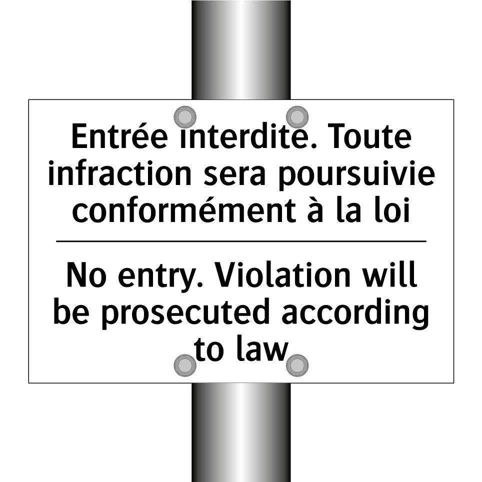 Panneau d'interdiction bilingue avec texte en français : "Entrée interdite. Toute infraction sera poursuivie conformément à la loi", et en anglais : "No entry. Violation will be prosecuted according to law"