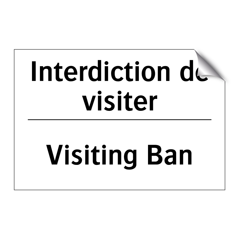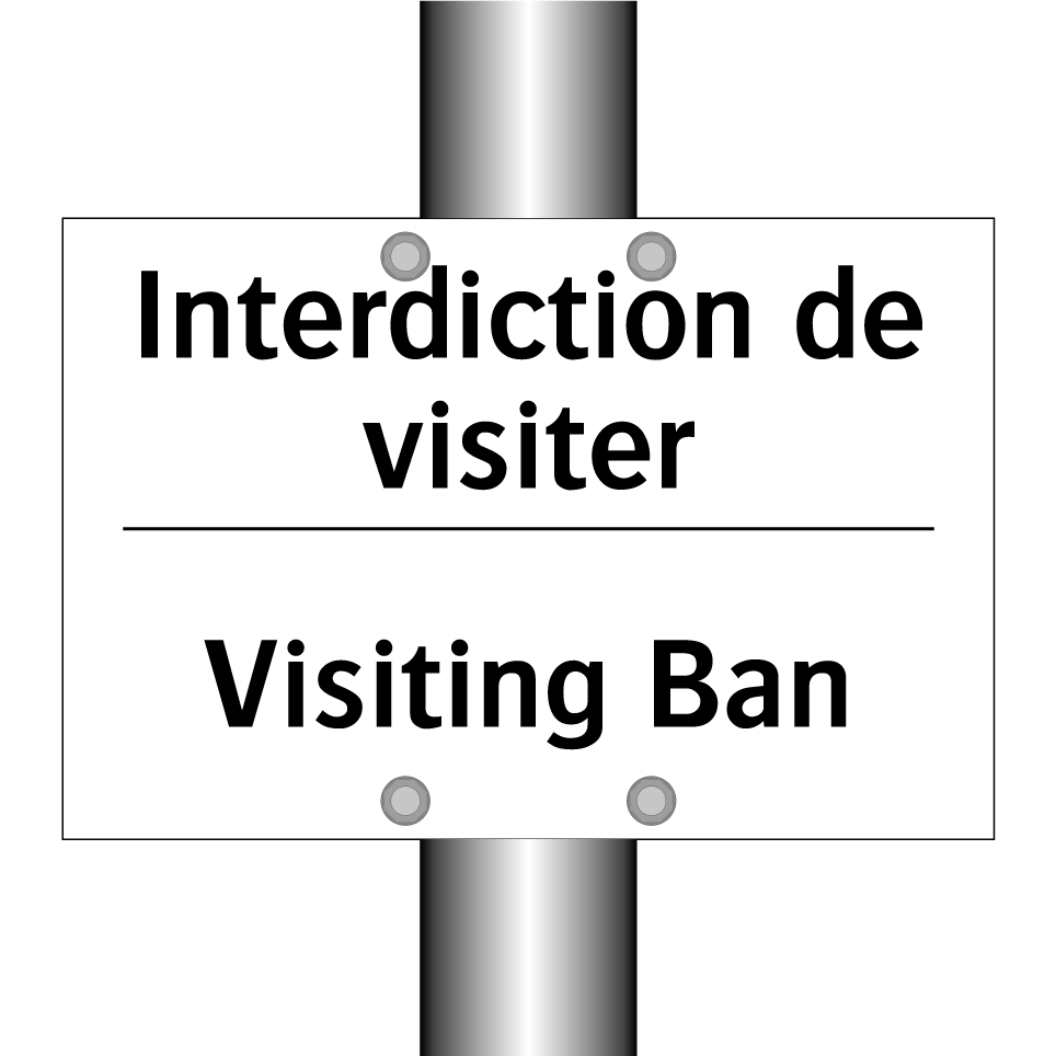 Panneau d'interdiction bilingue avec texte en français : "Interdiction de visiter", et en anglais : "Visiting Ban"