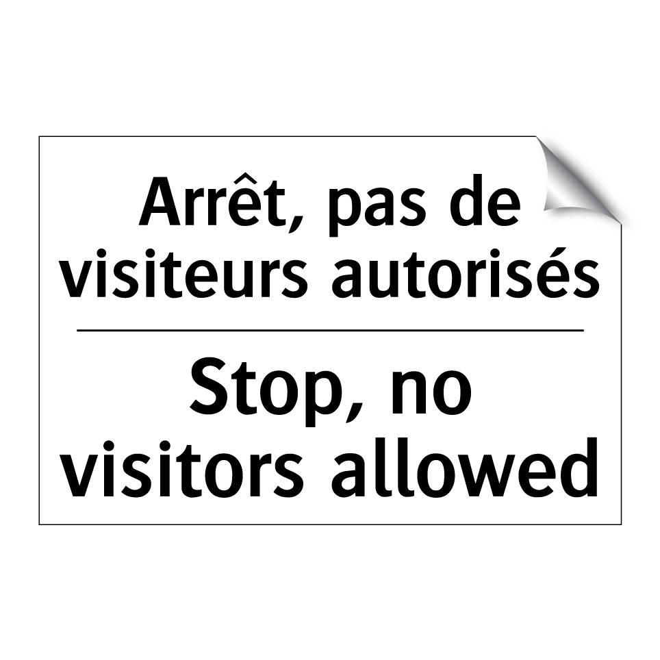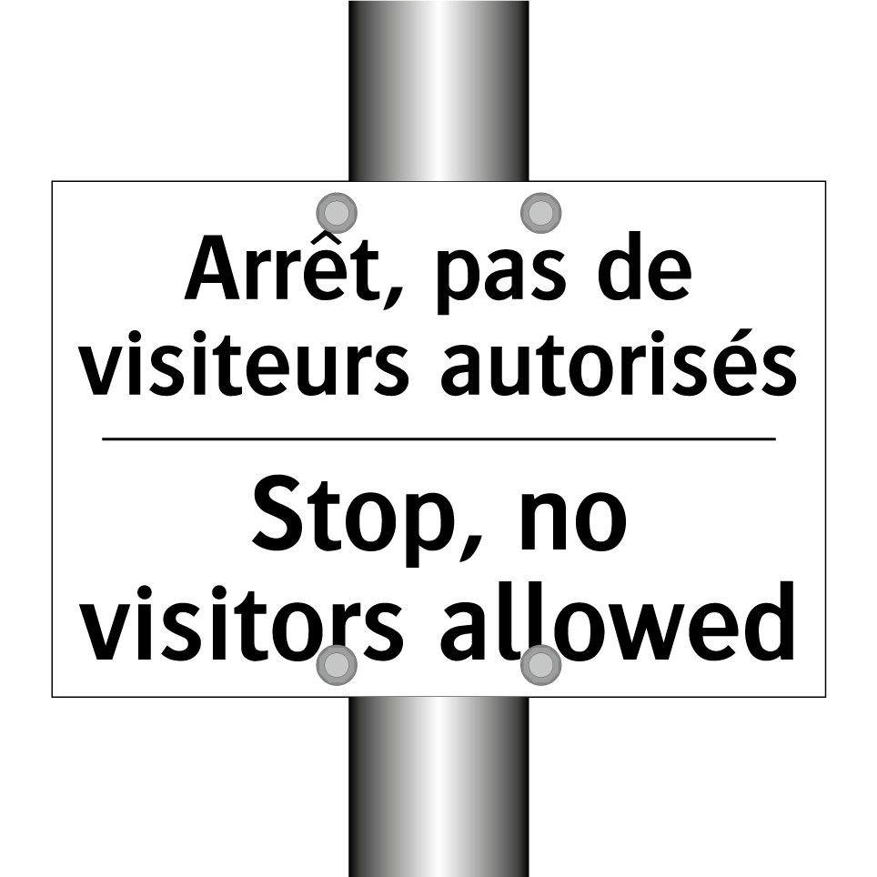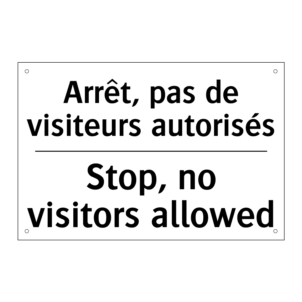 Panneau d'interdiction bilingue avec texte en français : "Arrêt, pas de visiteurs autorisés", et en anglais : "Stop, no visitors allowed"