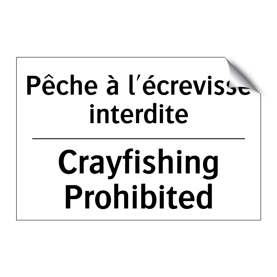 Panneau d'interdiction bilingue avec texte en français : "Pêche à l'écrevisse interdite", et en anglais : "Crayfishing Prohibited"