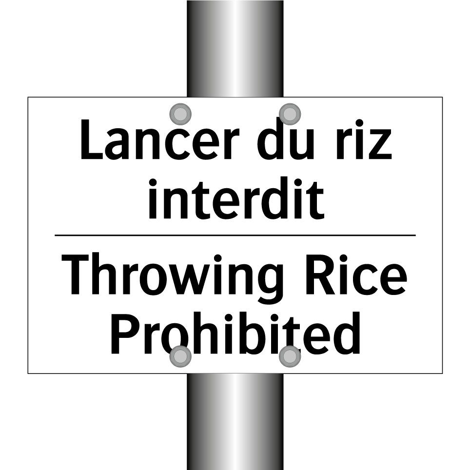 Panneau d'interdiction bilingue avec texte en français : "Lancer du riz interdit", et en anglais : "Throwing Rice Prohibited"