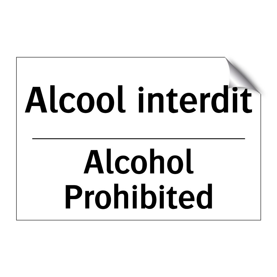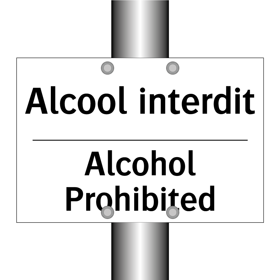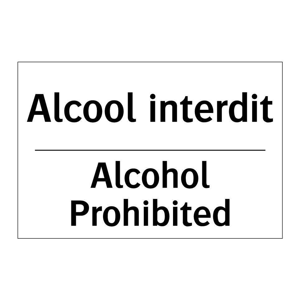 Panneau d'interdiction bilingue avec texte en français : "Alcool interdit", et en anglais : "Alcohol Prohibited"