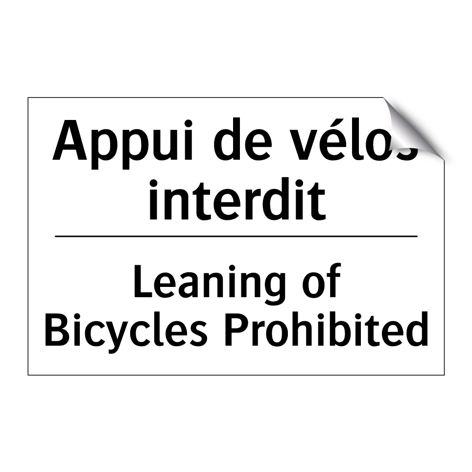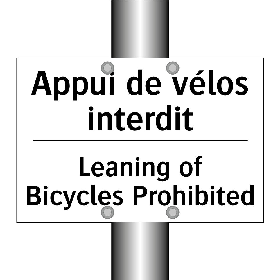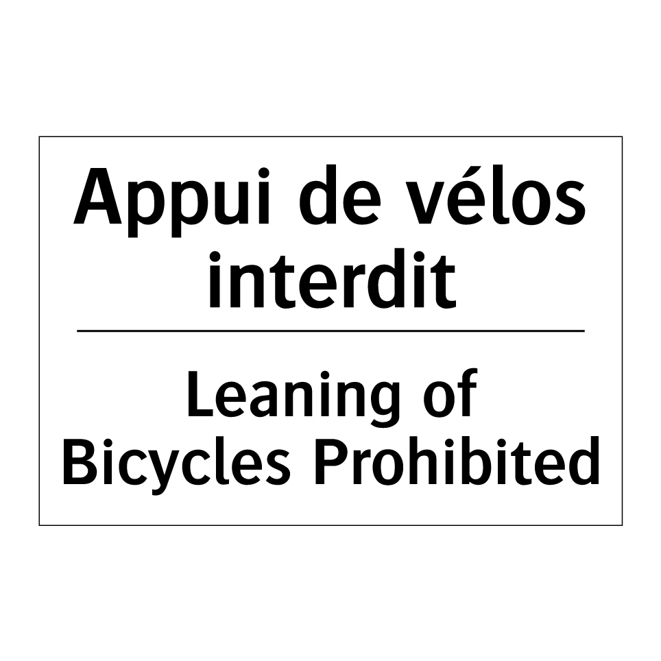 Panneau d'interdiction bilingue avec texte en français : "Appui de vélos interdit", et en anglais : "Leaning of Bicycles Prohibited"