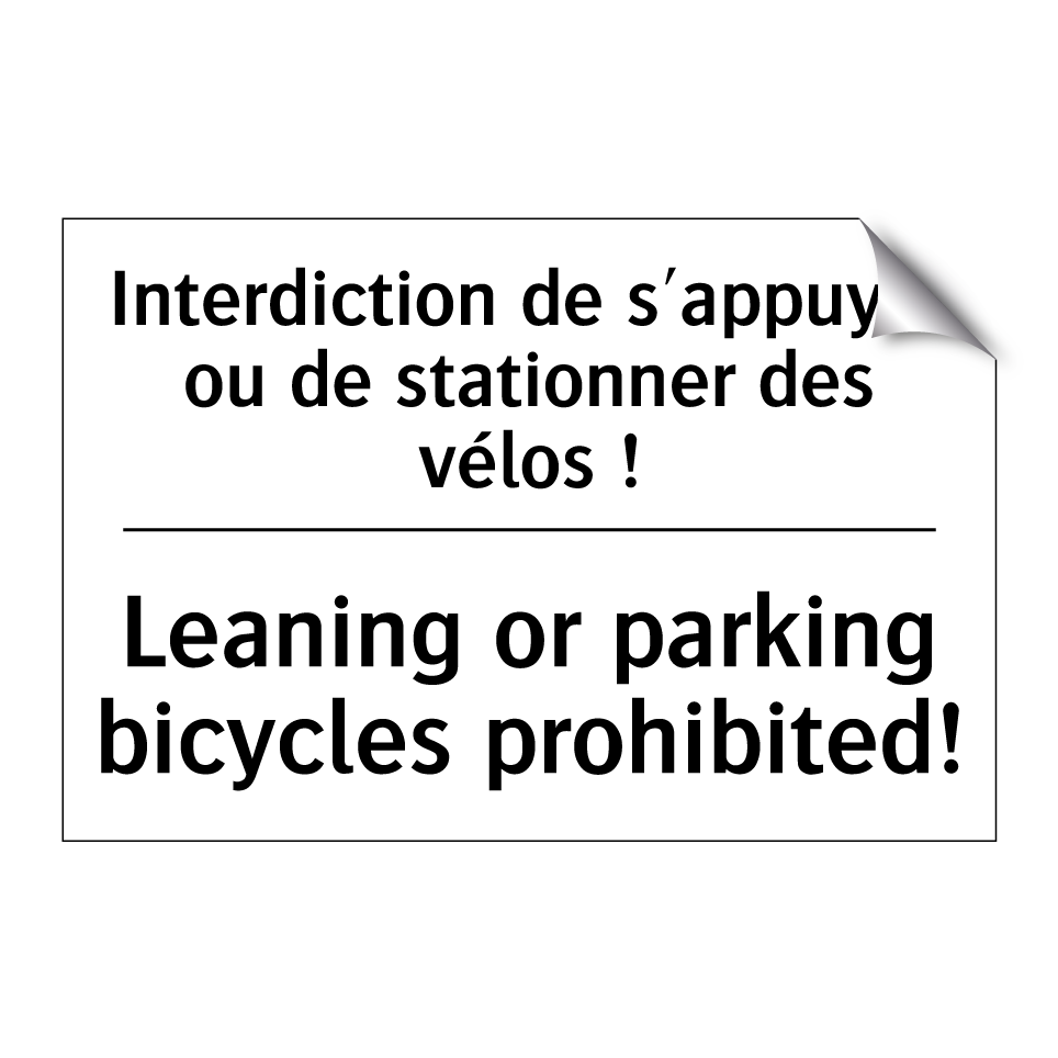 Panneau d'interdiction bilingue avec texte en français : "Interdiction de s'appuyer ou de stationner des vélos !", et en anglais : "Leaning or parking bicycles prohibited!"