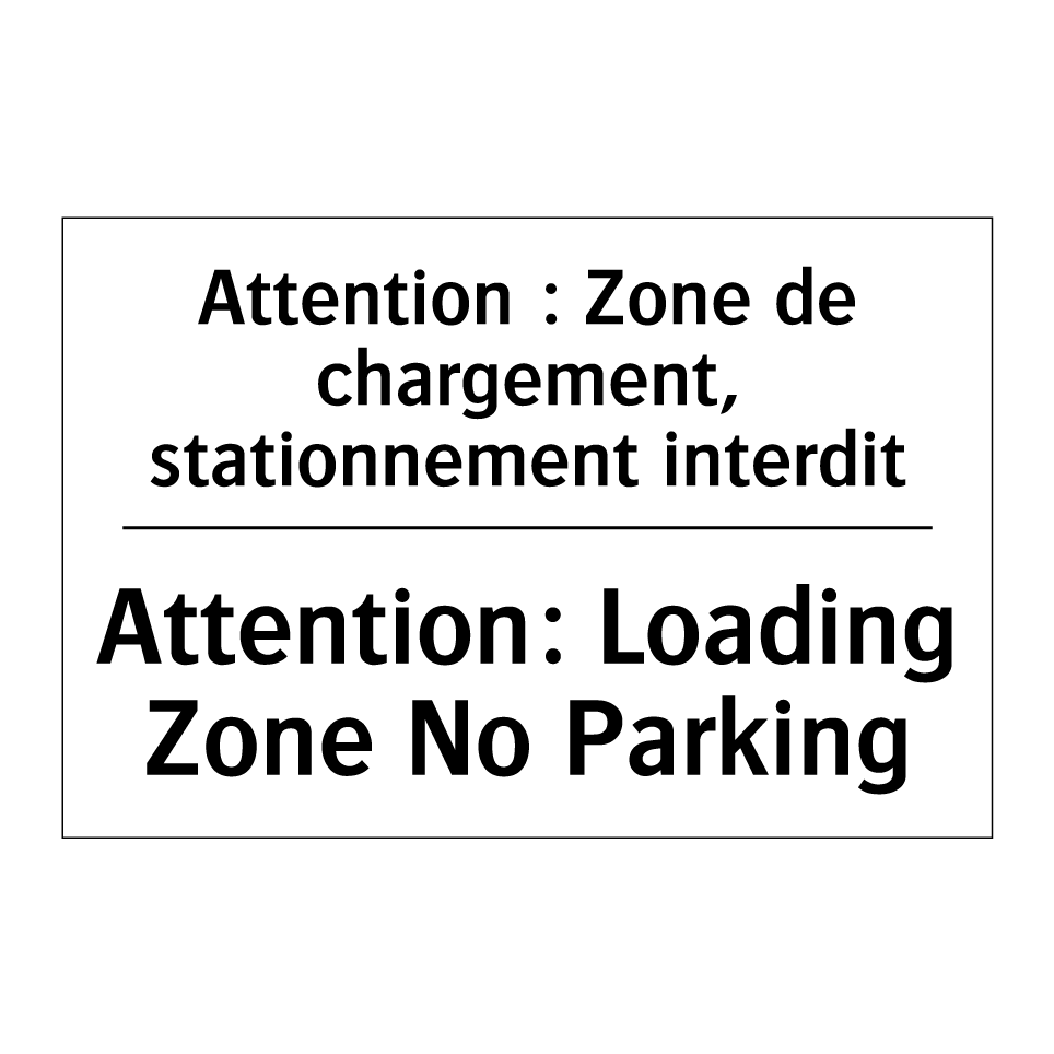 Panneau d'interdiction bilingue avec texte en français : "Attention : Zone de chargement, stationnement interdit", et en anglais : "Attention: Loading Zone No Parking"