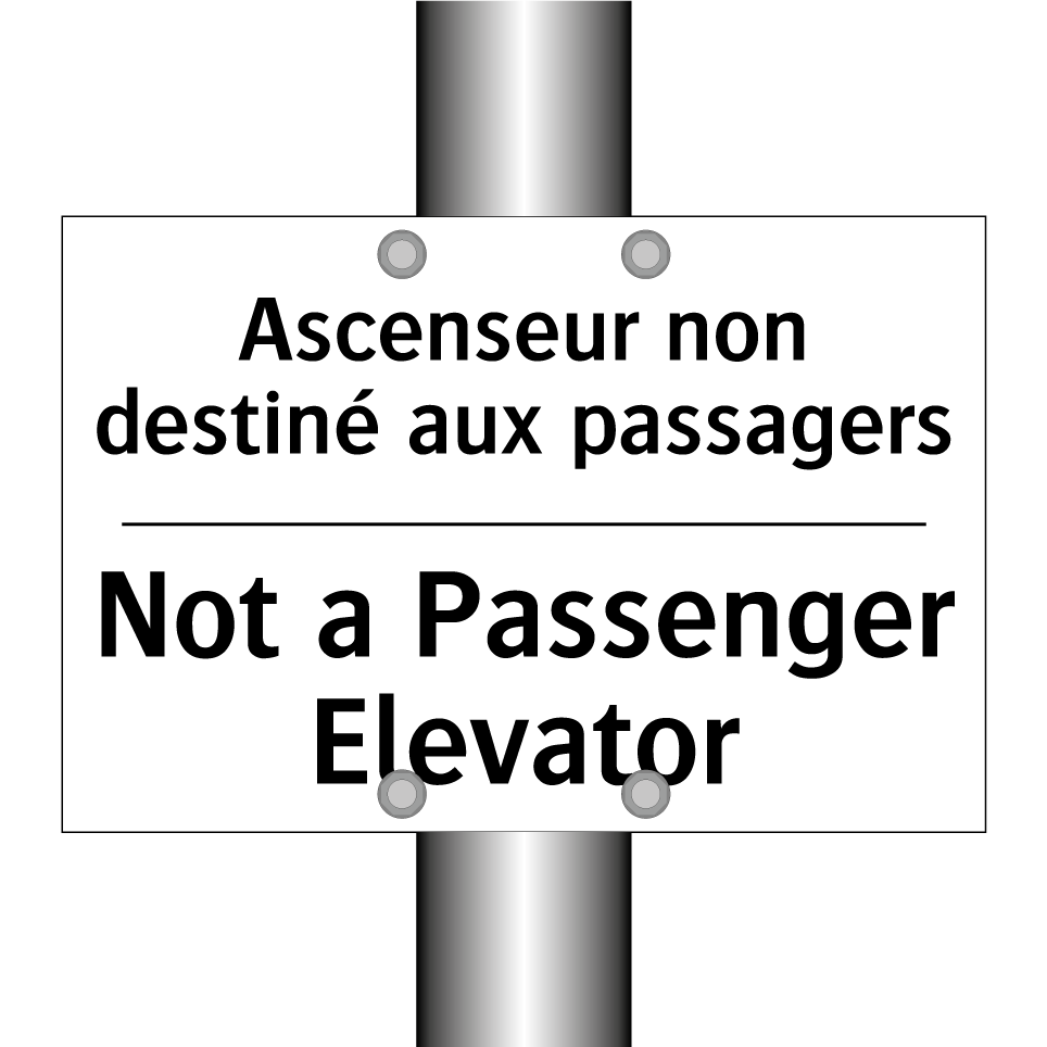Panneau d'interdiction bilingue avec texte en français : "Ascenseur non destiné aux passagers", et en anglais : "Not a Passenger Elevator"