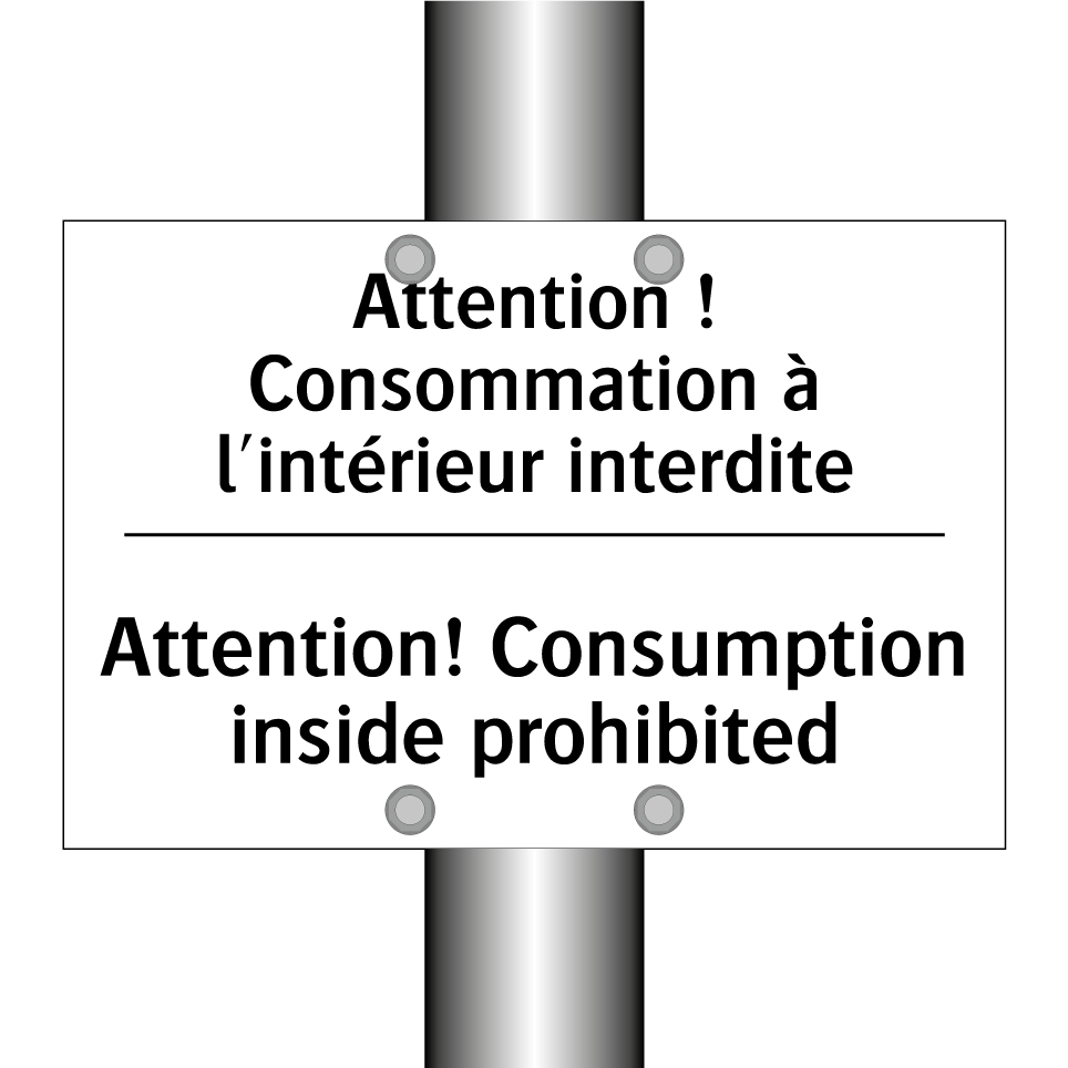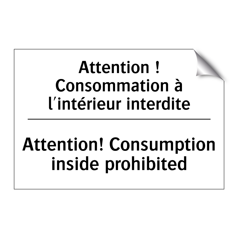 Panneau d'interdiction bilingue avec texte en français : "Attention ! Consommation à l'intérieur interdite", et en anglais : "Attention! Consumption inside prohibited"