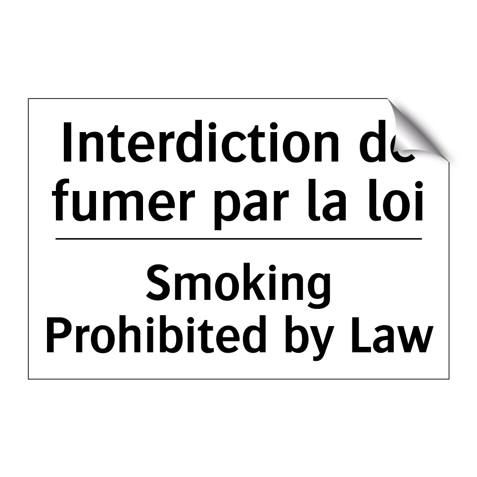 Panneau d'interdiction bilingue avec texte en français : "Interdiction de fumer par la loi", et en anglais : "Smoking Prohibited by Law"