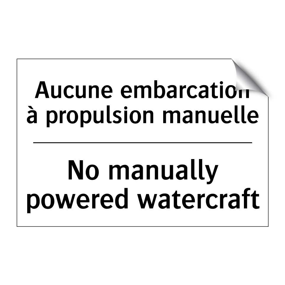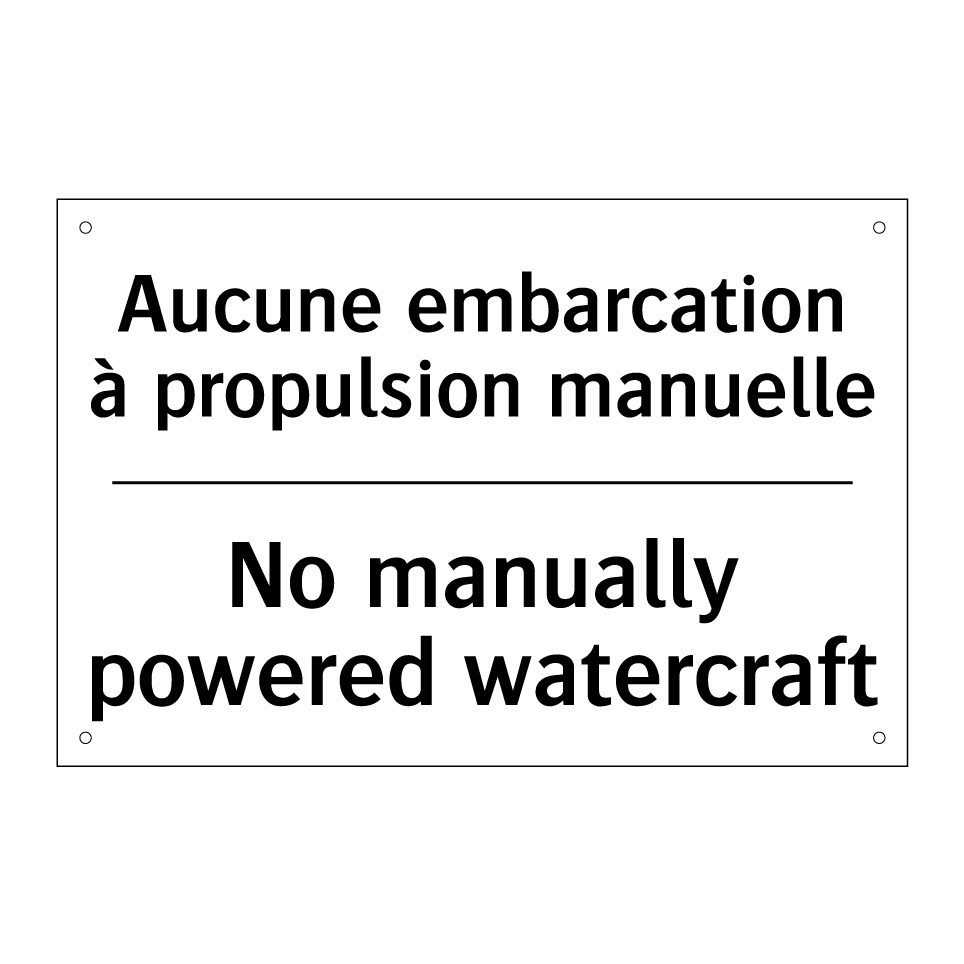 Panneau d'interdiction bilingue avec texte en français : "Aucune embarcation à propulsion manuelle", et en anglais : "No manually powered watercraft"