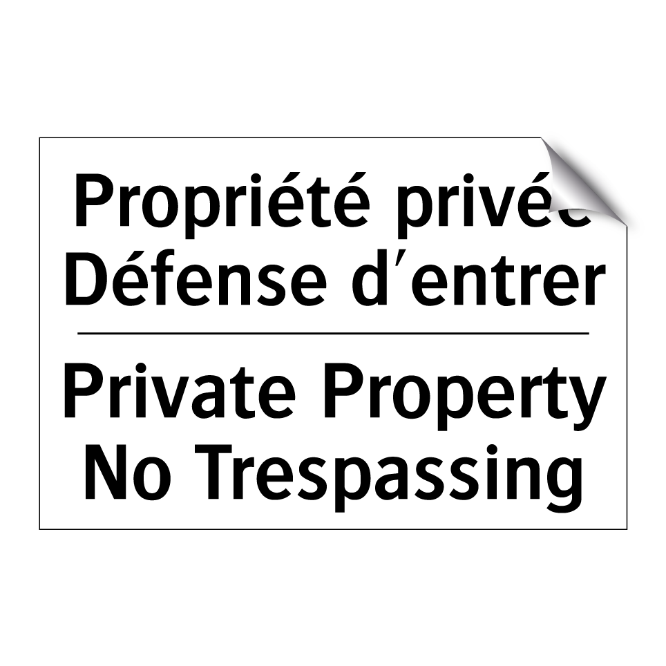 Panneau d'interdiction bilingue avec texte en français : "Propriété privée Défense d'entrer", et en anglais : "Private Property No Trespassing"