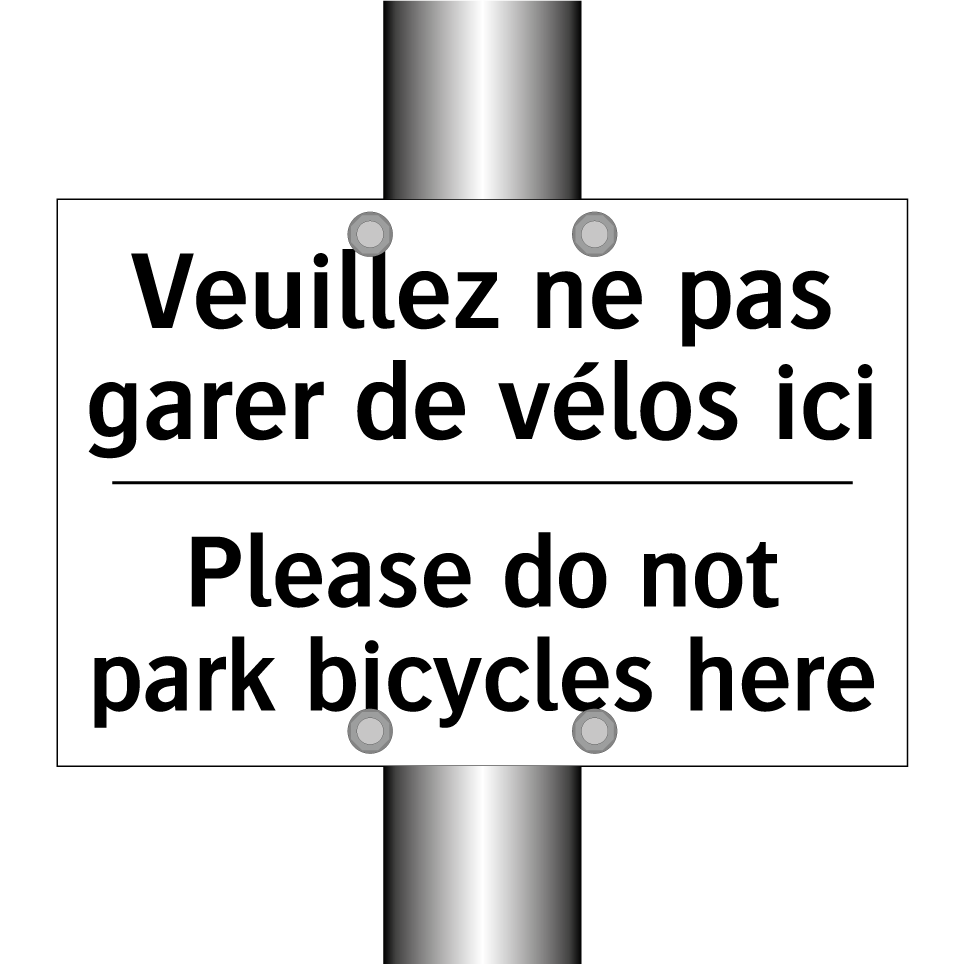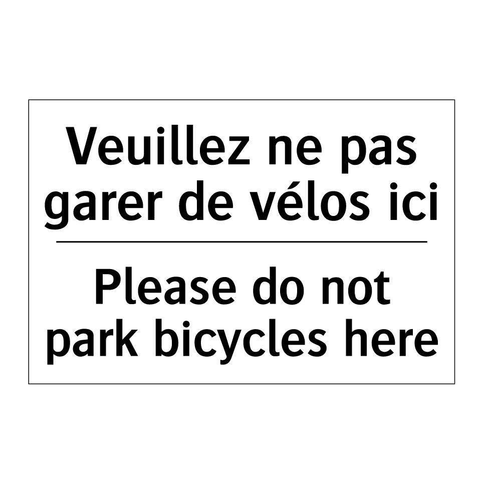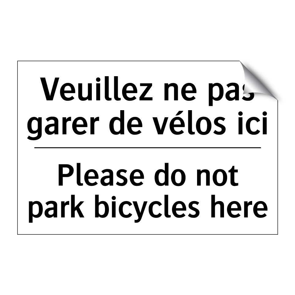 Panneau d'interdiction bilingue avec texte en français : "Veuillez ne pas garer de vélos ici", et en anglais : "Please do not park bicycles here"