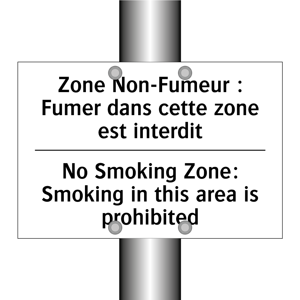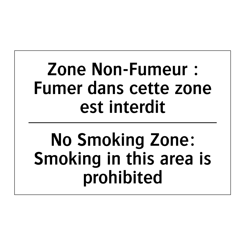 Panneau d'interdiction bilingue avec texte en français : "Zone Non-Fumeur : Fumer dans cette zone est interdit", et en anglais : "No Smoking Zone: Smoking in this area is prohibited"