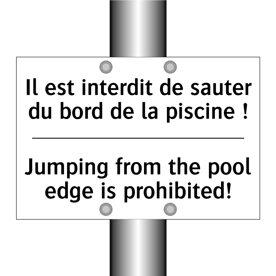 Panneau d'interdiction bilingue avec texte en français : "Il est interdit de sauter du bord de la piscine !", et en anglais : "Jumping from the pool edge is prohibited!"