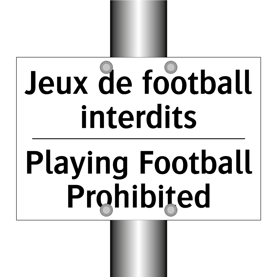 Panneau d'interdiction bilingue avec texte en français : "Jeux de football interdits", et en anglais : "Playing Football Prohibited"