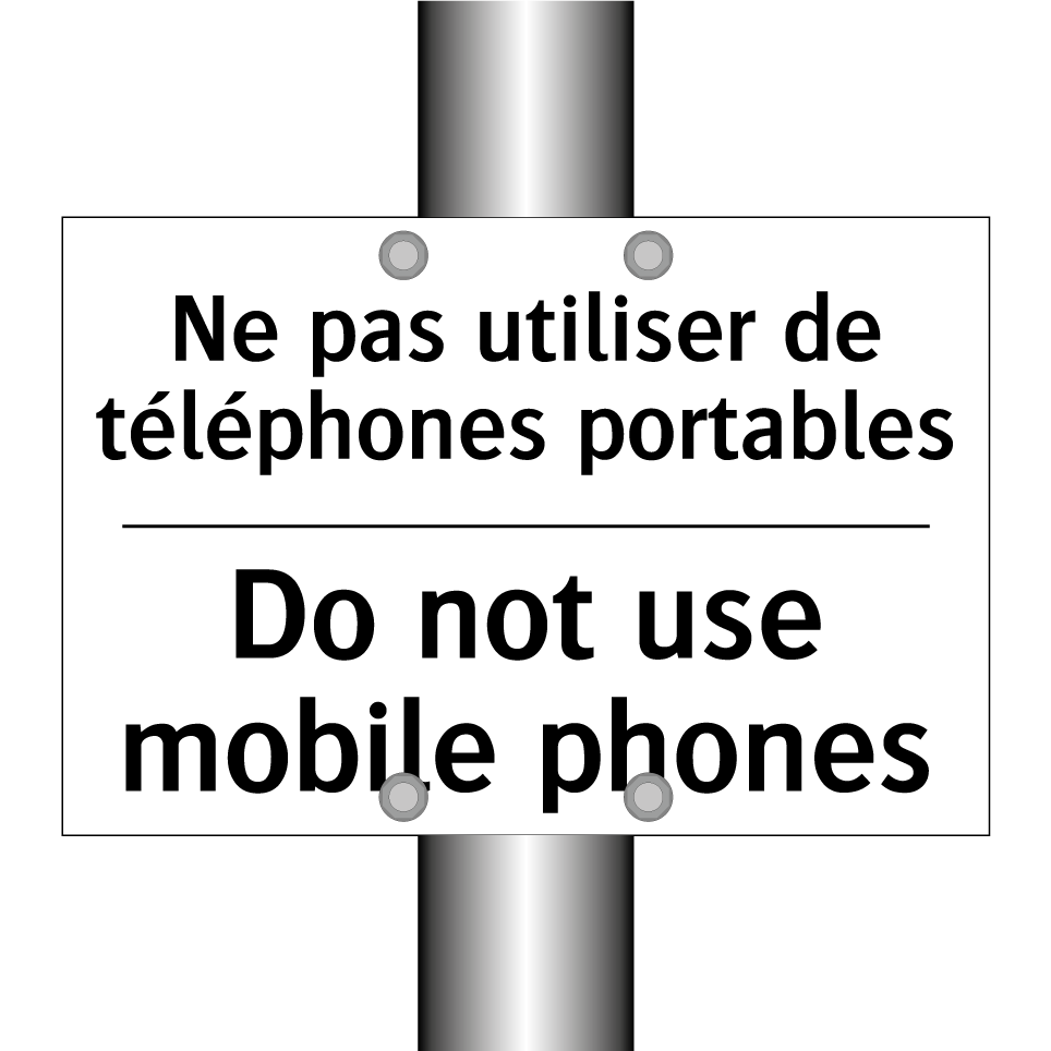 Panneau d'interdiction bilingue avec texte en français : "Ne pas utiliser de téléphones portables", et en anglais : "Do not use mobile phones"