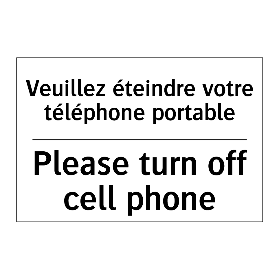 Panneau d'interdiction bilingue avec texte en français : "Veuillez éteindre votre téléphone portable", et en anglais : "Please turn off cell phone"